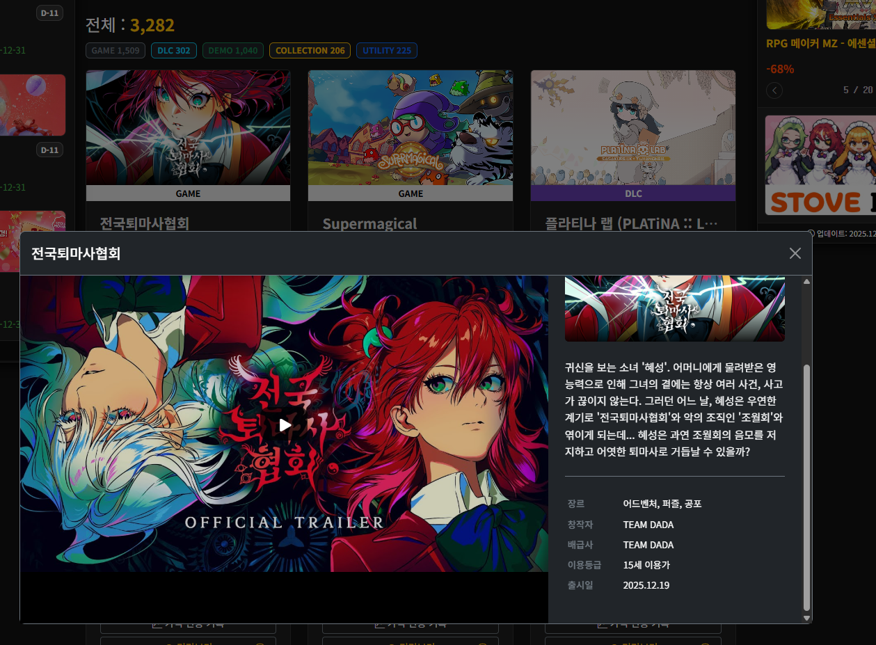 유튜브 영상 + 게임 배너 + 간략소개 + 장르, 창작자, 배급사, 이용등급, 출시일 (입력된 값만) 나옵니다.