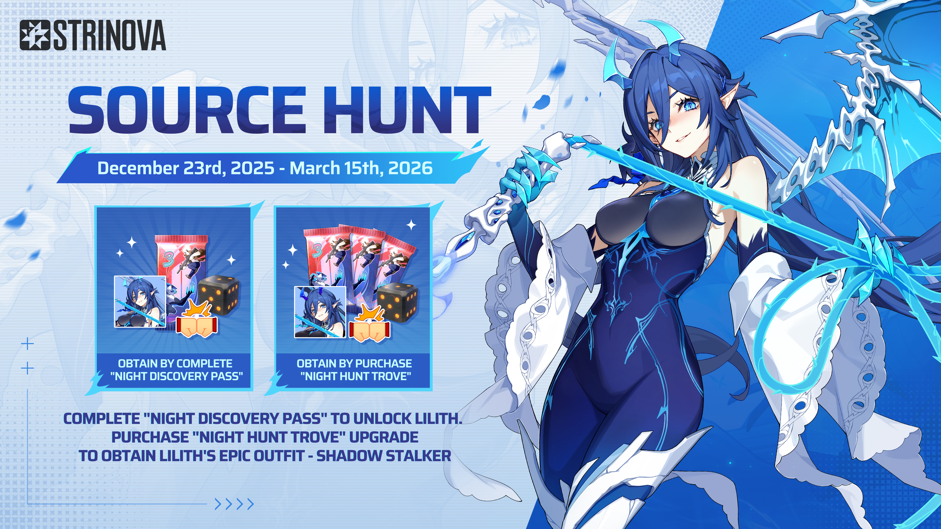 - 이벤트 기간 동안, 네비게이터는 주간 퀘스트를 완료하여 원천 추적 사냥 이벤트 레벨을 올리고 보상을 해제할 수 있습니다. 또한, 야간 사냥 패스 또는 야간 사냥 컬렉션을 구매하면 더욱 풍성한 보상을 해제할 수 있습니다. 야간 사냥 컬렉션을 구매하면 릴리스의 신화 등급 스킨 [야간 사냥 시간]을 추가로 획득할 수 있습니다.