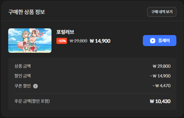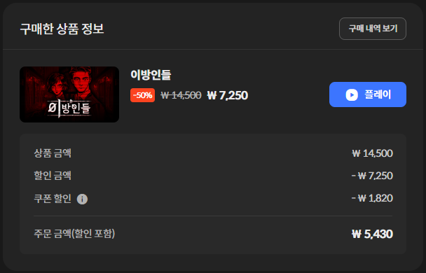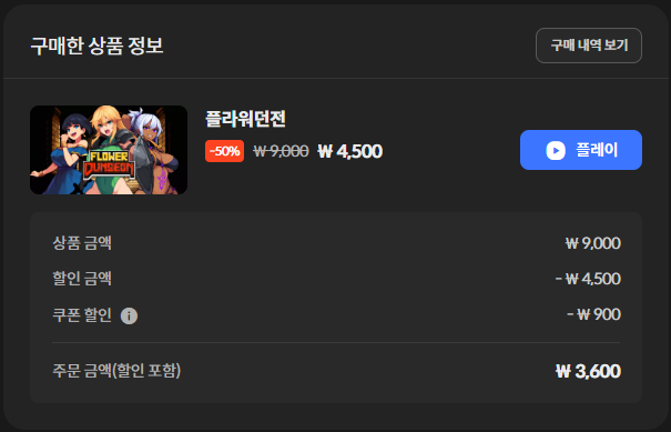 글상세💬 Small Talk [💬SmallTallk] 게임구매 [3] Kario9 26/12/2025 12:24 PM 26/12/2025 09:24 PM (+09:00) view count 11 View MY HOME View Posts Report Share 오늘은 포링러브, 이방인들, 플라워던전을 구매했습니다.구매하려는 게임 모두 현재 50% 할인중인 게임인데 30%, 25%, 20% 중복 불가 쿠폰들을 적용해서 저렴하게 구매했네요. Reply 3 alarm Notification has been disabled. Newest Newest By registration By recommendation To enter a comment Log In Please Chim 27/12/2025 04:50 AM 27/12/2025 01:50 PM (+09:00) View MY HOME View Posts Report Report ㅊㅊ 10223394 26/12/2025 12:29 PM 26/12/2025 09:29 PM (+09:00) View MY HOME View Posts Report ㅋ Confirm Cancel Confirm