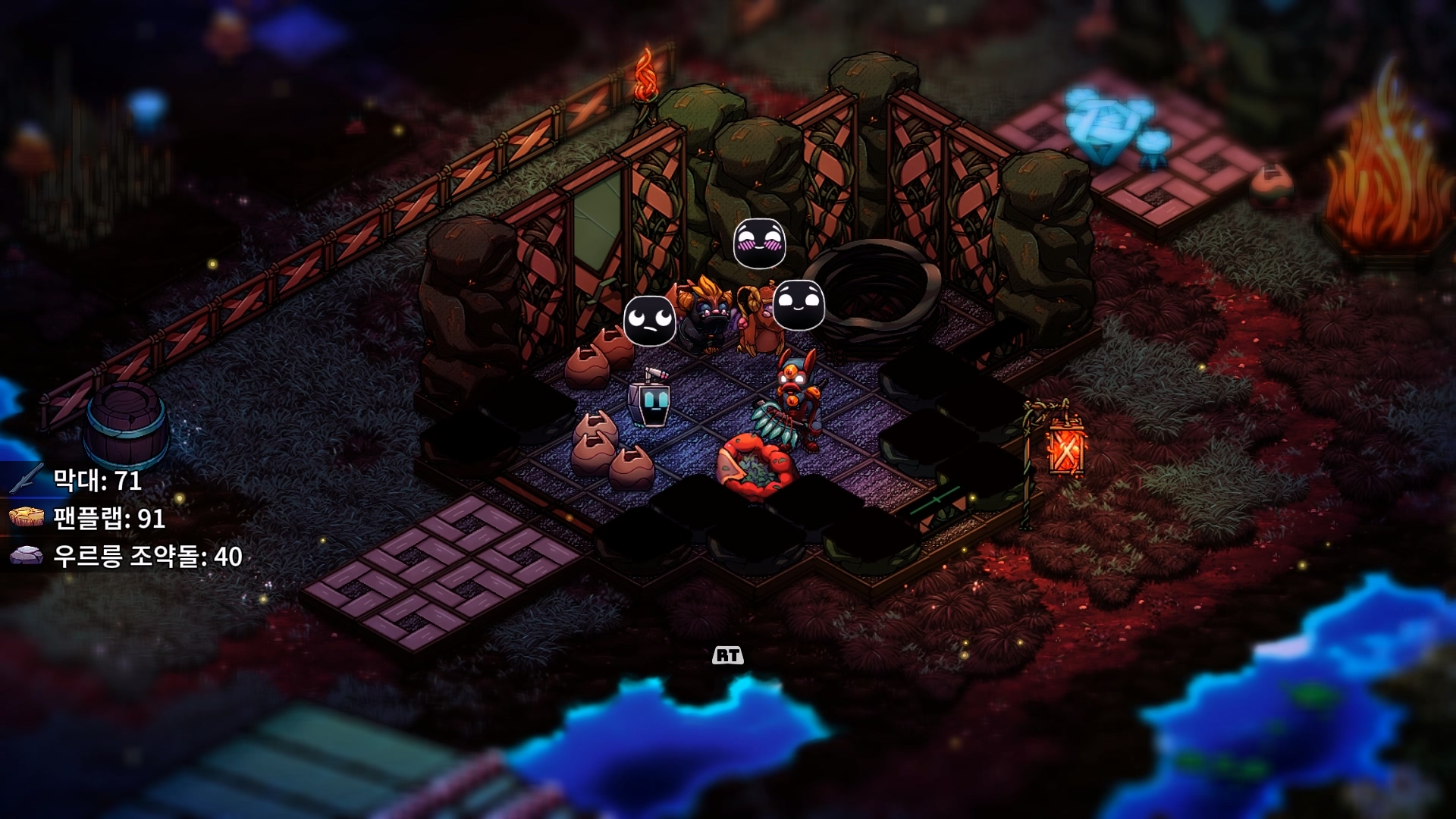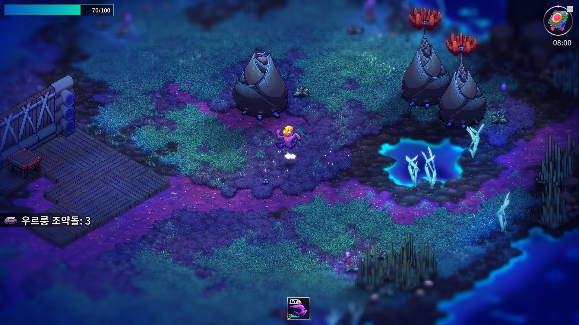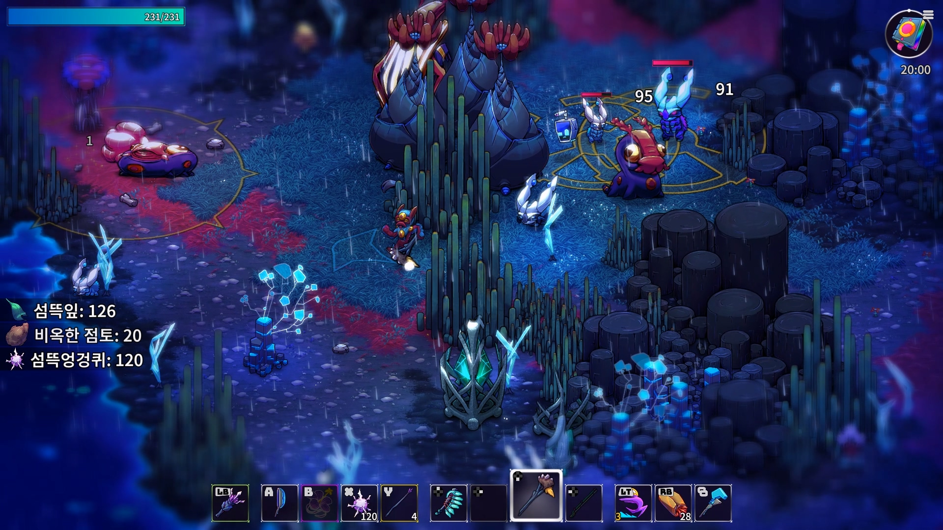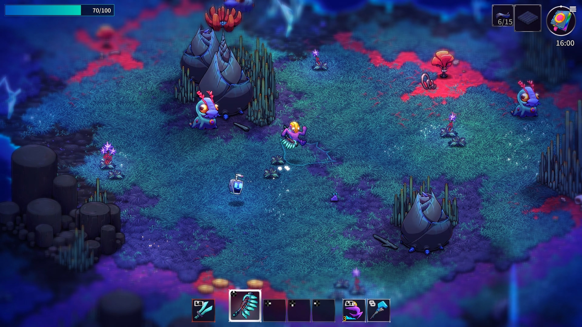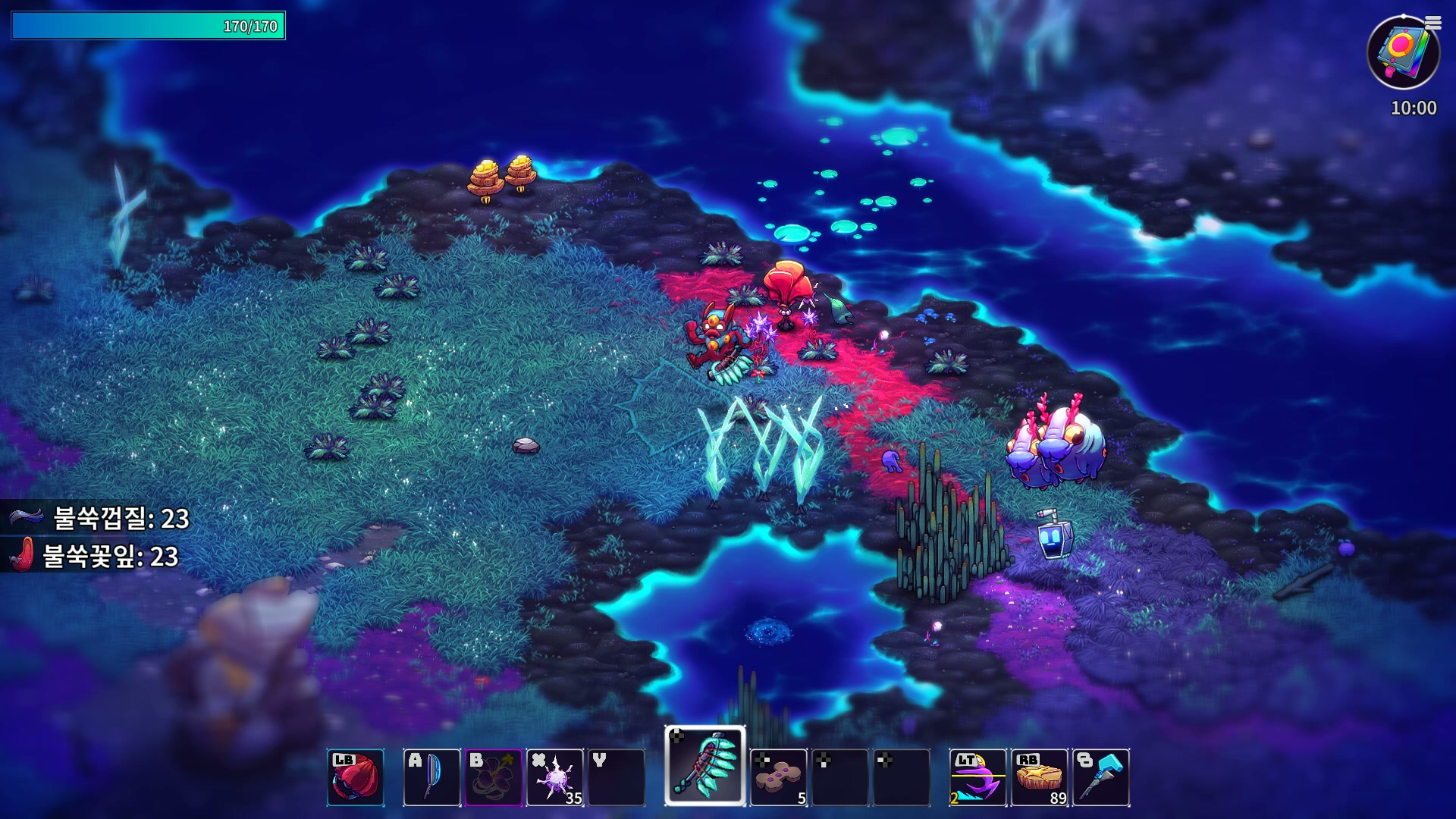 이게 다른 생명체에게도 예외가 아니라 적당히 거리를 벌리고 지켜보면, 다른 생명체들끼리 싸움이 벌어질 때도 많다. 다른 생명체들끼리 알아서 싸우는 과정도 재밌지만, 이렇게 싸우다보면 각 생명체가 지니고 있던 자원들이 바닥에 마구 떨어져 재료 수급이 상당히 편해진다. 그야말로 미지의 생태계에서 펼쳐지는 전쟁같은 광경과 더불어 어부지리식으로 이득을 취할 수 있는 게임의 환경이 상당히 흥미롭다.