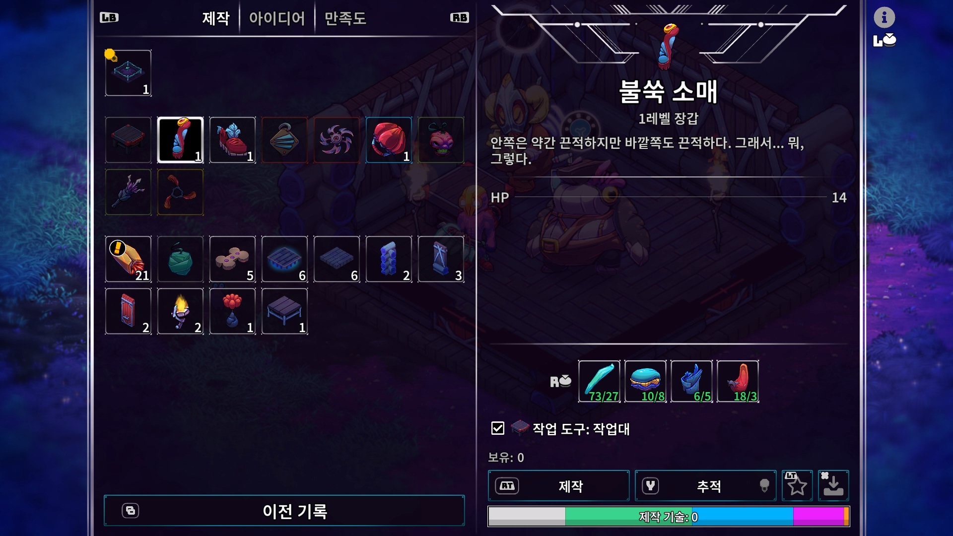 그래도 인벤토리가 없어서 발생하는 뜻밖의 이득도 있다. 인벤토리가 없으니 들고 다니는 아이템의 개수라던가 무게 제한 같은 제약도 없다. 이런 제약이 없으니 당연히 창고도 존재하지 않는다. 재료 아이템을 무한정 들고다닐 수 있으니 굳이 창고 같은 곳에 아이템을 쟁여둘 필요도 없는 것이다. 덕분의 제작을 위한 재료를 수집하는 과정이 한결 수월해진다. 어차피 대부분의 자원은 어떻게든 제작에 사용되니 자원이 보이면 일단 획득해두면 된다. 어찌보면 인벤토리가 없어 보유한 아이템을 파악할 수 없다는 불편함이 있긴 해도, 역으로 인벤토리를 굳이 신경쓸 필요가 없어 게임 플레이는 오히려 한결 쾌적해진 셈이다.
