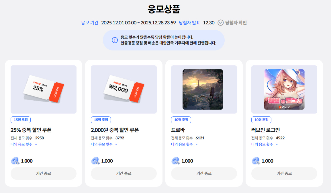 @ 스토브 스토어 출석체크 응모상품 당첨자 발표 [12.30]