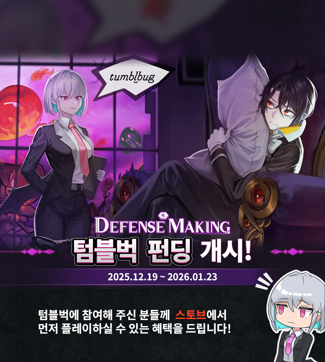현재는 텀블벅에서 “디펜스&메이킹”이라는 전략 디펜스게임을 개발 및 펀딩 진행하고 있습니다.우리 팀의 정체성을 알려줄 수 있는 문구 추가 - 창의적이고 재밌는 게임성, 플레이가 끝난 뒤에도 여운이 남는 경험을 만드는 것을 목표로 모인 팀입니다.