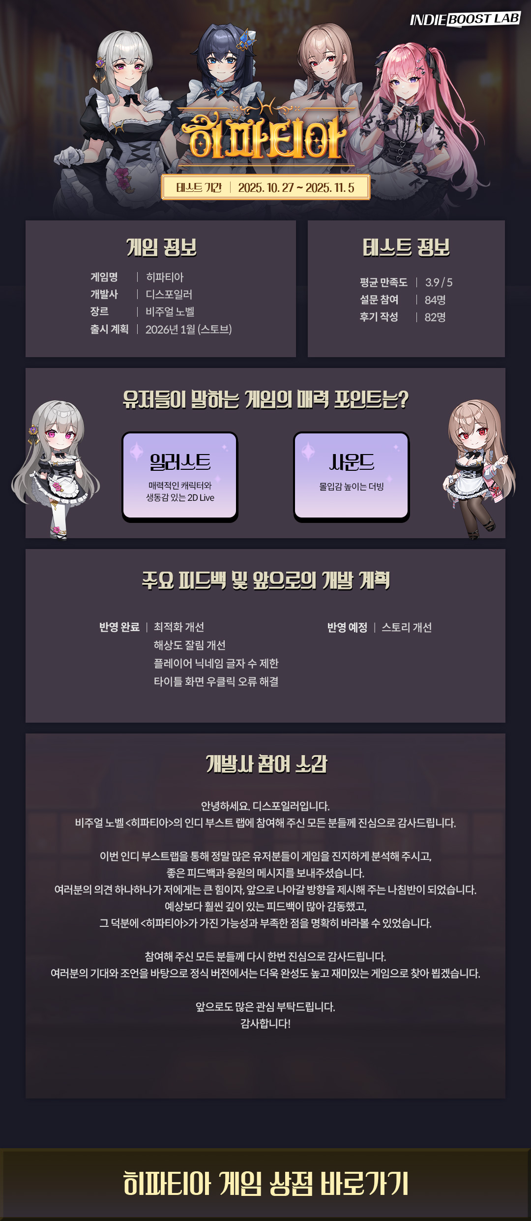 개발사의 참여 후기와 앞으로의 개발·출시 계획을 한 장의 이미지로 확인해 보세요!