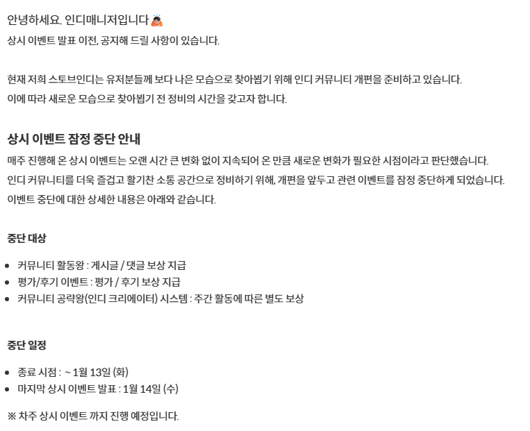 글상세😁 Free Talk [FreeTalk] 그동안 우리와 함께했던 컨텐츠가 떠나가네요 [42] 브라키움 08/01/2026 12:18 PM 08/01/2026 09:18 PM (+09:00) view count 117 View MY HOME View Posts Report Share 그동안 라운지에서 진행됐던 여러 이벤트들이 마무리되어서 아쉽지만, 커뮤니티 개편과 함께 더 즐거운 시간이 찾아올 거라 기대해 봅니다잠시 쉬어가는 시간 동안 그간 쌓인 추억을 떠올리며, 다음에 다시 만날 이벤트들을 기대할게요! Reply 42 alarm Notification has been disabled. Newest Newest By registration By recommendation To enter a comment Log In Please dvna 19/01/2026 01:46 PM 19/01/2026 10:46 PM (+09:00) View MY HOME View Posts Report Nice! 브라키움 Written by 20/01/2026 12:00 PM 20/01/2026 09:00 PM (+09:00) View MY HOME View Posts Report @dvna 이콘클 11/01/2026 10:53 PM 12/01/2026 07:53 AM (+09:00) View MY HOME View Posts Report Nice! 브라키움 Written by 13/01/2026 03:34 AM 13/01/2026 12:34 PM (+09:00) View MY HOME View Posts Report S1759414746439912 11/01/2026 12:54 AM 11/01/2026 09:54 AM (-NaN:NaN) View MY HOME View Posts Report Nice! 브라키움 Written by 13/01/2026 03:34 AM 13/01/2026 12:34 PM (+09:00) View MY HOME View Posts Report 모두가행복한하루 10/01/2026 08:38 AM 10/01/2026 05:38 PM (+09:00) View MY HOME View Posts Report 브라키움 Written by 10/01/2026 08:52 AM 10/01/2026 05:52 PM (+09:00) View MY HOME View Posts Report 세오로두 10/01/2026 04:01 AM 10/01/2026 01:01 PM (+09:00) View MY HOME View Posts Report Nice! 브라키움 Written by 10/01/2026 08:52 AM 10/01/2026 05:52 PM (+09:00) View MY HOME View Posts Report 호롤롤나 10/01/2026 02:41 AM 10/01/2026 11:41 AM (+09:00) View MY HOME View Posts Report 브라키움 Written by 10/01/2026 08:53 AM 10/01/2026 05:53 PM (+09:00) View MY HOME View Posts Report 솔플러1 10/01/2026 02:04 AM 10/01/2026 11:04 AM (+09:00) View MY HOME View Posts Report ㅊㅊ 브라키움 Written by 10/01/2026 08:53 AM 10/01/2026 05:53 PM (+09:00) View MY HOME View Posts Report 190954681 09/01/2026 07:19 AM 09/01/2026 04:19 PM (+09:00) View MY HOME View Posts Report 안돼 내 쿠폰 브라키움 Written by 10/01/2026 08:53 AM 10/01/2026 05:53 PM (+09:00) View MY HOME View Posts Report 확실히 아쉽긴 하네요 ㅜㅜ 리즈의리즈시절 09/01/2026 03:51 AM 09/01/2026 12:51 PM (+09:00) View MY HOME View Posts Report 브라키움 Written by 10/01/2026 08:53 AM 10/01/2026 05:53 PM (+09:00) View MY HOME View Posts Report 기간이 긴 쿠폰들은 이제 다 없애는 것 같아요 내이상형편수희 09/01/2026 01:50 AM 09/01/2026 10:50 AM (+09:00) View MY HOME View Posts Report 브라키움 Written by 09/01/2026 02:20 AM 09/01/2026 11:20 AM (+09:00) View MY HOME View Posts Report GomGomNoob 08/01/2026 11:46 PM 09/01/2026 08:46 AM (+09:00) View MY HOME View Posts Report 더 혜자스럽고 강력하고 좋은 이벤트로 돌아오길! 브라키움 Written by 09/01/2026 02:21 AM 09/01/2026 11:21 AM (+09:00) View MY HOME View Posts Report 그랬으면 좋겠네요...!! 위스키캣 08/01/2026 11:40 PM 09/01/2026 08:40 AM (+09:00) View MY HOME View Posts Report 브라키움 Written by 09/01/2026 02:21 AM 09/01/2026 11:21 AM (+09:00) View MY HOME View Posts Report balro 08/01/2026 10:36 PM 09/01/2026 07:36 AM (+09:00) View MY HOME View Posts Report 더 나은 모습으로 볼 수 있길...! 브라키움 Written by 09/01/2026 02:21 AM 09/01/2026 11:21 AM (+09:00) View MY HOME View Posts Report 개편될 신규 시스템도 기대해봐야겠죠!! S3383552088311851 08/01/2026 05:05 PM 09/01/2026 02:05 AM (+09:00) View MY HOME View Posts Report 브라키움 Written by 09/01/2026 02:21 AM 09/01/2026 11:21 AM (+09:00) View MY HOME View Posts Report Report 브라키움 Written by 09/01/2026 02:21 AM 09/01/2026 11:21 AM (+09:00) View MY HOME View Posts Report Report 브라키움 Written by 09/01/2026 02:22 AM 09/01/2026 11:22 AM (+09:00) View MY HOME View Posts Report Report 브라키움 Written by 09/01/2026 02:22 AM 09/01/2026 11:22 AM (+09:00) View MY HOME View Posts Report 바이오맨 08/01/2026 02:13 PM 08/01/2026 11:13 PM (+09:00) View MY HOME View Posts Report 게임후기 평가 빨리 끝내야 겠네요 300개가 넘는데 ㅋㅋ.. 브라키움 Written by 09/01/2026 02:22 AM 09/01/2026 11:22 AM (+09:00) View MY HOME View Posts Report 저도 그래서 80개 몰아서 했어요 ㅋㅋㅋㅋ 명월일 08/01/2026 01:40 PM 08/01/2026 10:40 PM (+09:00) View MY HOME View Posts Report 이러면 메리트가.. 브라키움 Written by 09/01/2026 02:22 AM 09/01/2026 11:22 AM (+09:00) View MY HOME View Posts Report Chim 08/01/2026 01:24 PM 08/01/2026 10:24 PM (+09:00) View MY HOME View Posts Report 브라키움 Written by 09/01/2026 02:22 AM 09/01/2026 11:22 AM (+09:00) View MY HOME View Posts Report Confirm Cancel Confirm
