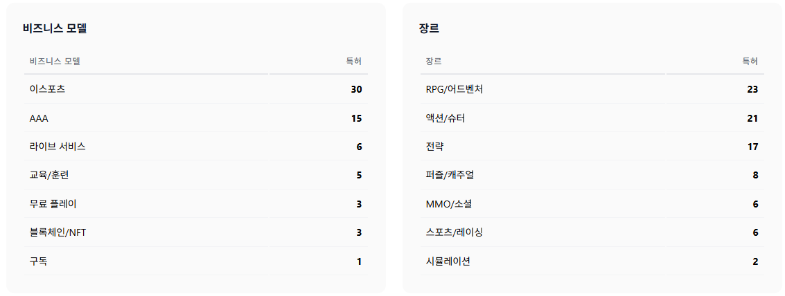 저 특허 분석이 엄청나더라고요. 대기업들이 주목하는 장르도 나타나고, 앞으로 만날 게임의 방향성도 보이고 말이죠.