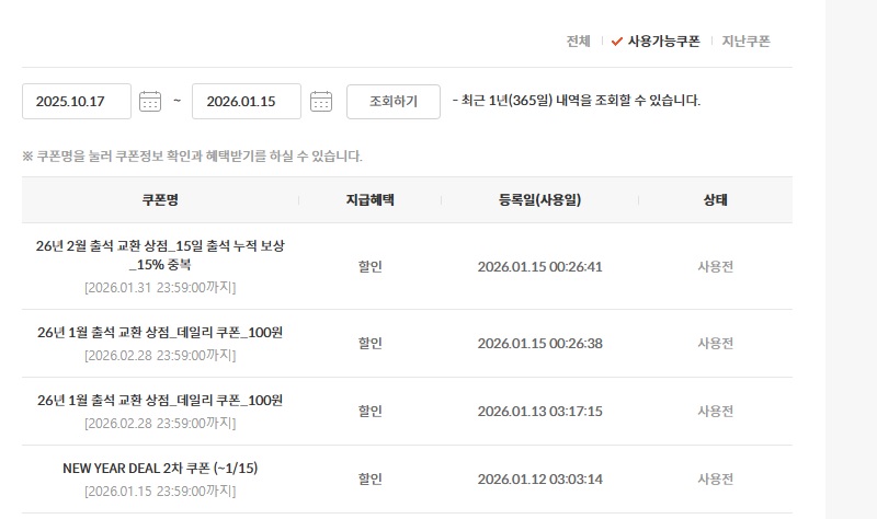 2026년 1월 출석 교환상점 이벤트인데 1을 2로 오입력하여 혼선을 빚게해드렸습니다. 쿠폰명 수정하였으며 그 외에는 쿠폰 이상 없으니 1월 쿠폰 잘 사용해주시면 감사하겠습니다!