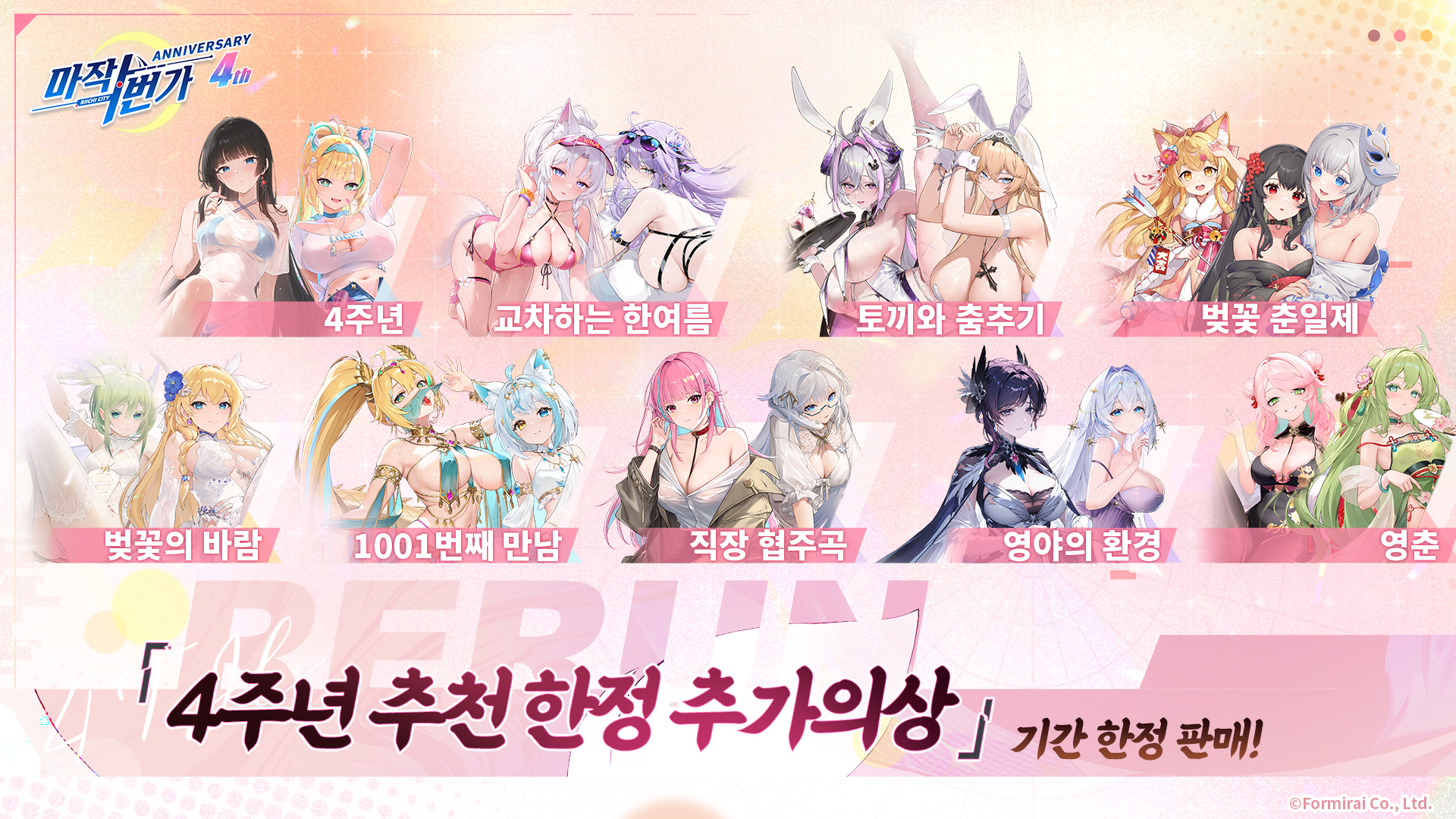 글상세Riichi City [Creator News] [마작일번가]【「연간 추천 한정추가의상」기간한정 복각】 [12] GM 마작일번가 18/01/2026 10:00 AM 18/01/2026 07:00 PM (+09:00) view count 165 View MY HOME View Posts Share 마작일번가 4주년 기념으로서,판매기간 중, 추가의상권을 사용하여 아래 시리즈의 추가의상을 구입할 수 있습니다:① 「4주년」 신규 추가의상② 「교차하는 한여름」 시리즈③ 「토끼와 춤추기」 시리즈④ 「벚꽃 춘일제」 시리즈⑤ 「벚꽃의 바람」 시리즈⑥ 「1001번째 만남」 시리즈⑦ 「직장 협주곡」 시리즈 시리즈⑧ 「영야의 환경」 시리즈⑨ 「영춘」 시리즈⑩ 「서킷 엔젤」 시리즈⏰판매기간:2026년 1월21일(수)업데이트 후 ~ 2026년 3월3일(화)04:59이번 기회를 놓치지 마세요!✨#마작일번가 #마작 Reply 12 alarm Notification has been disabled. Newest Newest By registration By recommendation To enter a comment Log In Please 이콘클 29/01/2026 11:55 PM 30/01/2026 08:55 AM (+09:00) View MY HOME View Posts Report Nice! 바이오맨 21/01/2026 02:36 PM 21/01/2026 11:36 PM (+09:00) View MY HOME View Posts Report Report Report S1748252816237411 19/01/2026 01:31 PM 19/01/2026 10:31 PM (+09:00) View MY HOME View Posts Report S1724236578760412 19/01/2026 07:54 AM 19/01/2026 04:54 PM (+09:00) View MY HOME View Posts Report Asdeqa 19/01/2026 07:35 AM 19/01/2026 04:35 PM (+09:00) View MY HOME View Posts Report 솔플러1 19/01/2026 02:32 AM 19/01/2026 11:32 AM (+09:00) View MY HOME View Posts Report ㅊㅊ Report ㅊ S1736330304816812 18/01/2026 02:39 PM 18/01/2026 11:39 PM (+09:00) View MY HOME View Posts Report 창밖거리 18/01/2026 02:29 PM 18/01/2026 11:29 PM (+09:00) View MY HOME View Posts Report 1000LoVE 18/01/2026 10:27 AM 18/01/2026 07:27 PM (+09:00) View MY HOME View Posts Report Confirm Cancel Confirm