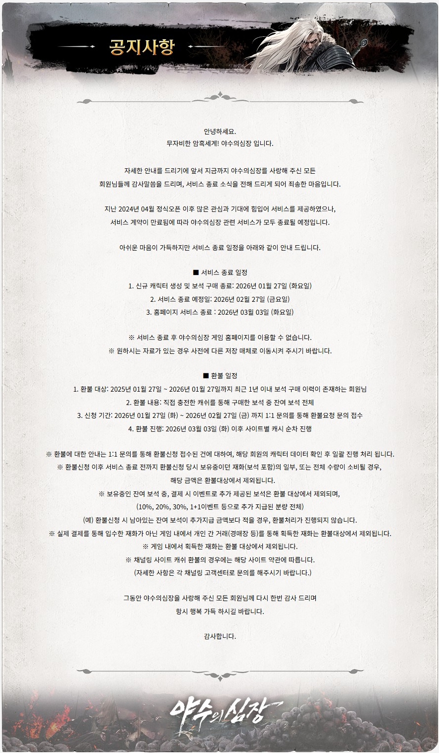THE HEART OF THE BEAST's post List OFFICIAL 게임매니저 View MY HOME View Posts 작성 시간 27/01/2026 야수의심장 서비스 종료 안내 27/01/2026 27/01/2026 02:20 AM OFFICIAL 게임매니저 View MY HOME View Posts 작성 시간 26/04/2024 야수의심장★론칭 안내 26/04/2024 26/04/2024 02:00 AM OFFICIAL 게임매니저 View MY HOME View Posts 작성 시간 03/04/2024 야수의심장★사전 예약 안내 03/04/2024 03/04/2024 04:02 AM OFFICIAL 게임매니저 View MY HOME View Posts 작성 시간 03/04/2024 야수의 심장 게임★커뮤니티 개설 안내 03/04/2024 03/04/2024 04:00 AM