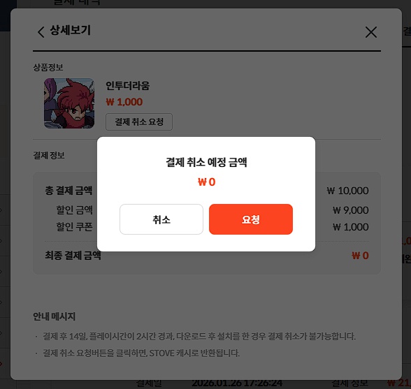 이건 14일 이내 구매 2시간 이하 플래이 라는 일반적인 구매 취소조건을 만족시킬때 할수 있는거고 동작 되던 게임이 갑자기 실행 자체가 안되서 환불을 받으려 한다면 그땐 고객 센터를 통하셔야 합니다.
