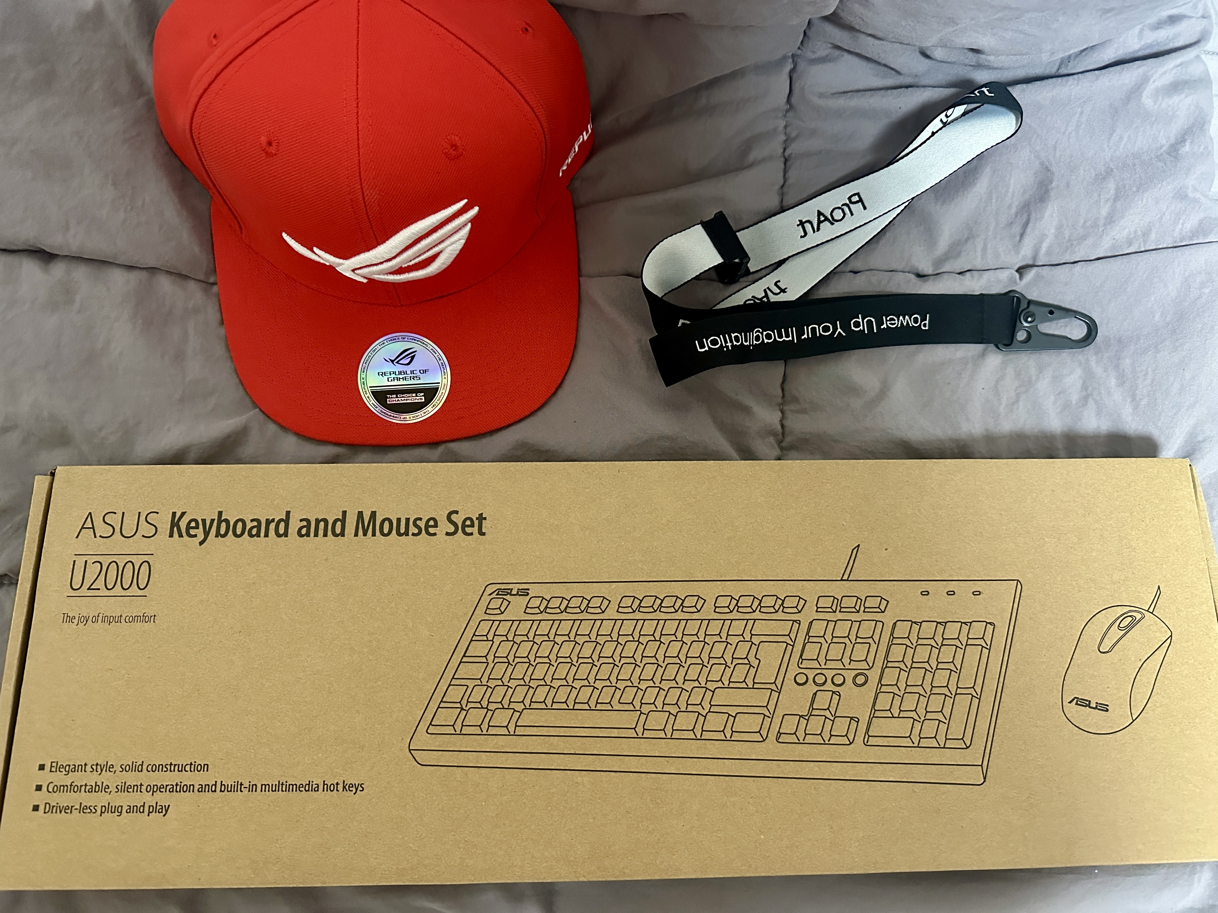 키보드 & 마우스 세트와 모자, 그리고 랜야드(스트랩)이 들어있었습니다.