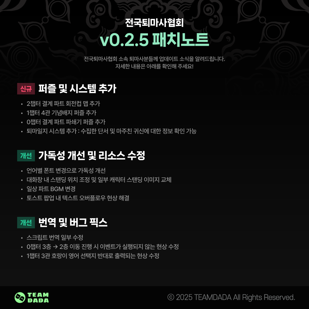 퇴마사님들을 위한 v0.2.5 업데이트를 안내해 드립니다.
