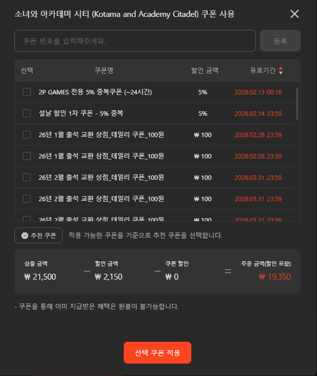 글상세😁 Free Talk [FreeTalk] (해결완료) 이벤트 매니저님 소녀와 아카데미 시티 쇼츠 쿠폰 적용이 안 됩니다 [6] 덤비면문다고 12/02/2026 09:21 AM 12/02/2026 06:21 PM (+09:00) view count 41 View MY HOME View Posts Report Share 쇼츠 링크를 통해 할인 쿠폰이 들어온 건 쿠폰함에서 확인이 됐는데정작 적용하려 하니 쿠폰 목록에 뜨지 않습니다.확인 한 번 부탁드립니다!+이제 목록에 제대로 뜨네요.반영이 느렸던 건지 고쳐주신 건지 모르겠지만 감사합니다! Reply 6 alarm Notification has been disabled. Newest Newest By registration By recommendation To enter a comment Log In Please 190954681 13/02/2026 04:41 PM 14/02/2026 01:41 AM (+09:00) View MY HOME View Posts Report 리즈의리즈시절 13/02/2026 10:44 AM 13/02/2026 07:44 PM (+09:00) View MY HOME View Posts Report 미도우 13/02/2026 04:36 AM 13/02/2026 01:36 PM (+09:00) View MY HOME View Posts Report ㅊ S1759414746439912 13/02/2026 02:20 AM 13/02/2026 11:20 AM (+09:00) View MY HOME View Posts Report Nice! 바드냥냥이 12/02/2026 11:29 AM 12/02/2026 08:29 PM (+09:00) View MY HOME View Posts Report ㄷㄷㄷㄷ OFFICIAL 이벤트매니저 12/02/2026 09:33 AM 12/02/2026 06:33 PM (+09:00) View MY HOME View Posts 안녕하세요! 이벤트 매니저입니다:D스토브 설날세일을 누구보다 빠르게~! 즐겨주셔서 감사합니다!해당 쿠폰 적용 대상이 업데이트되어, 현재는 정상적으로 사용 가능한 점 안내드립니다.즐거운 플레이되시기 바랍니다! 새해 복 많이 받으세요~!🙇♀️ Confirm Cancel Confirm