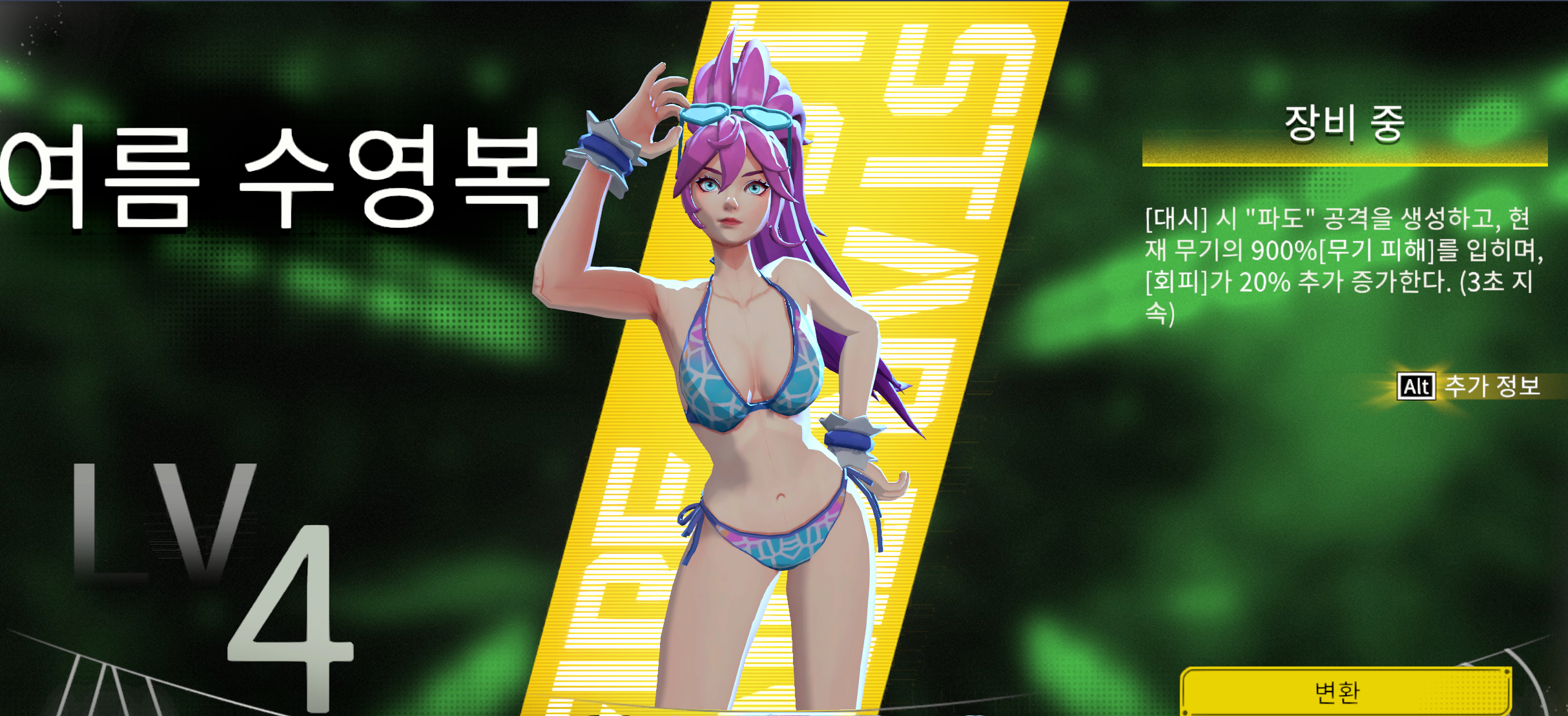 스킨은 총 4레벨까지 강화 가능하며 , 원하는 모습으로 변환해서 사용 가능합니다.