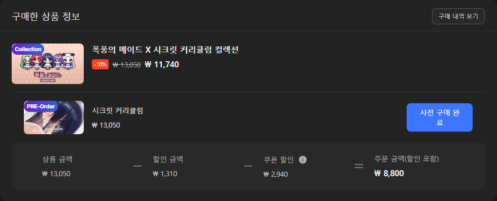 글상세💬 Small Talk [💬SmallTallk] 오늘의 게임 구매! [3] 덤비면문다고 25/02/2026 02:20 AM 25/02/2026 11:20 AM (+09:00) view count 19 View MY HOME View Posts Report Share 25일 출석 25% 할인 쿠폰으로 <시크릿 커리큘럼> 구매했습니다.컬렉션으로 구매하니 기존에 가지고 있던 게임 가격 빠지고 컬렉션 할인까지 있어서 더 싸게 구매했네요.<시크릿 커리큘럼> 사전 판매 할인 기간은 내일 오후 4시까지니 놓치지 말고 빨리 구매하시는 걸 추천드립니다! Reply 3 alarm Notification has been disabled. Newest Newest By registration By recommendation To enter a comment Log In Please 내이상형편수희 25/02/2026 02:57 PM 25/02/2026 11:57 PM (+09:00) View MY HOME View Posts Report Chim 25/02/2026 10:46 AM 25/02/2026 07:46 PM (+09:00) View MY HOME View Posts Report S1751348968930711 25/02/2026 06:49 AM 25/02/2026 03:49 PM (+09:00) View MY HOME View Posts Report cc Confirm Cancel Confirm
