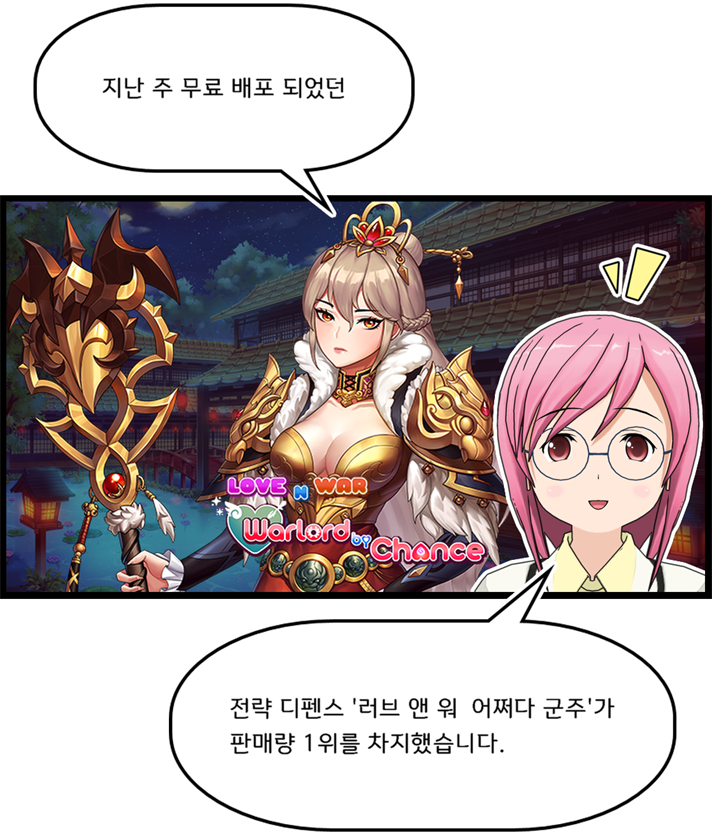 * 에이전트 A: 지난 주 무료 배포 되었던 전략 디펜스 게임. '러브 앤 워 어쩌다 군주'가 판매량 1위를 차지했습니다.