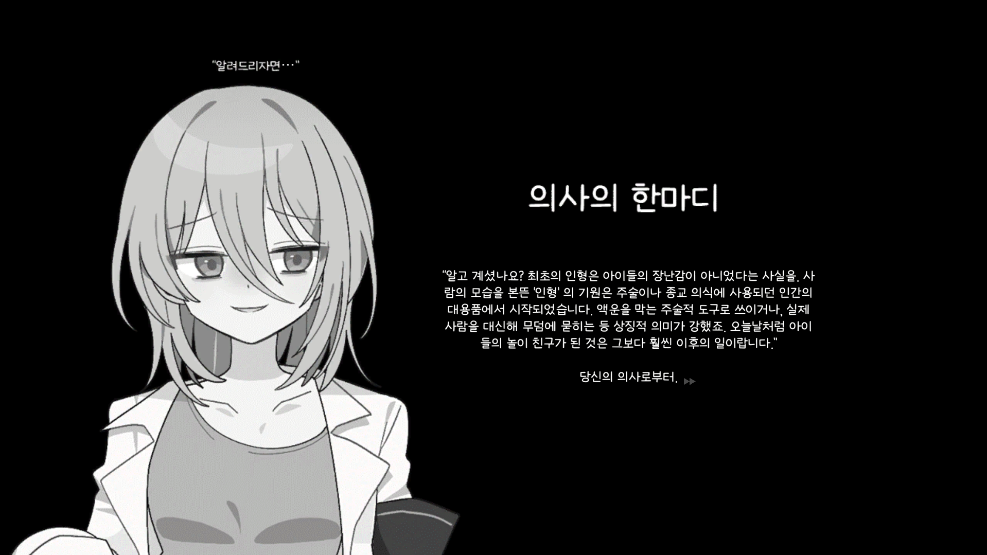 사실 그때 데모 할 때도 이 의사쌤 말 듣고싶어서 일부러 배드엔딩 골라갔었는데, 데모할때도 '게임오버 엔딩 다 봐주셔서 너무 감사하다'고 들었었는데, 이번에도 2일차 3일차 배드엔딩 다 봤습니다 ㅋㅋ 너무 재밌어요
