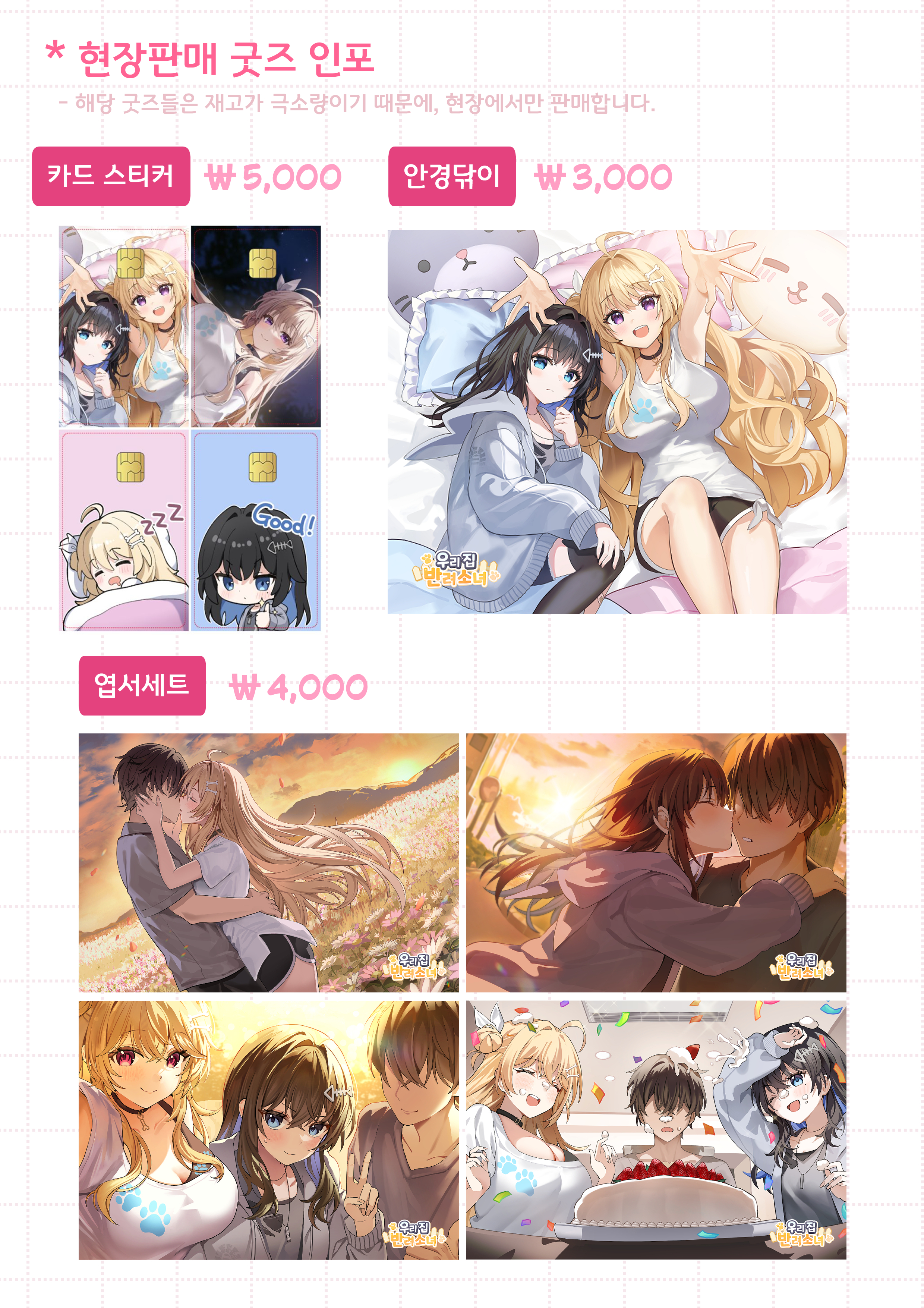 일부 굿즈(카드 스티커, 안경닦이, 엽서 세트 등)는 현장 한정 판매로 진행됩니다.