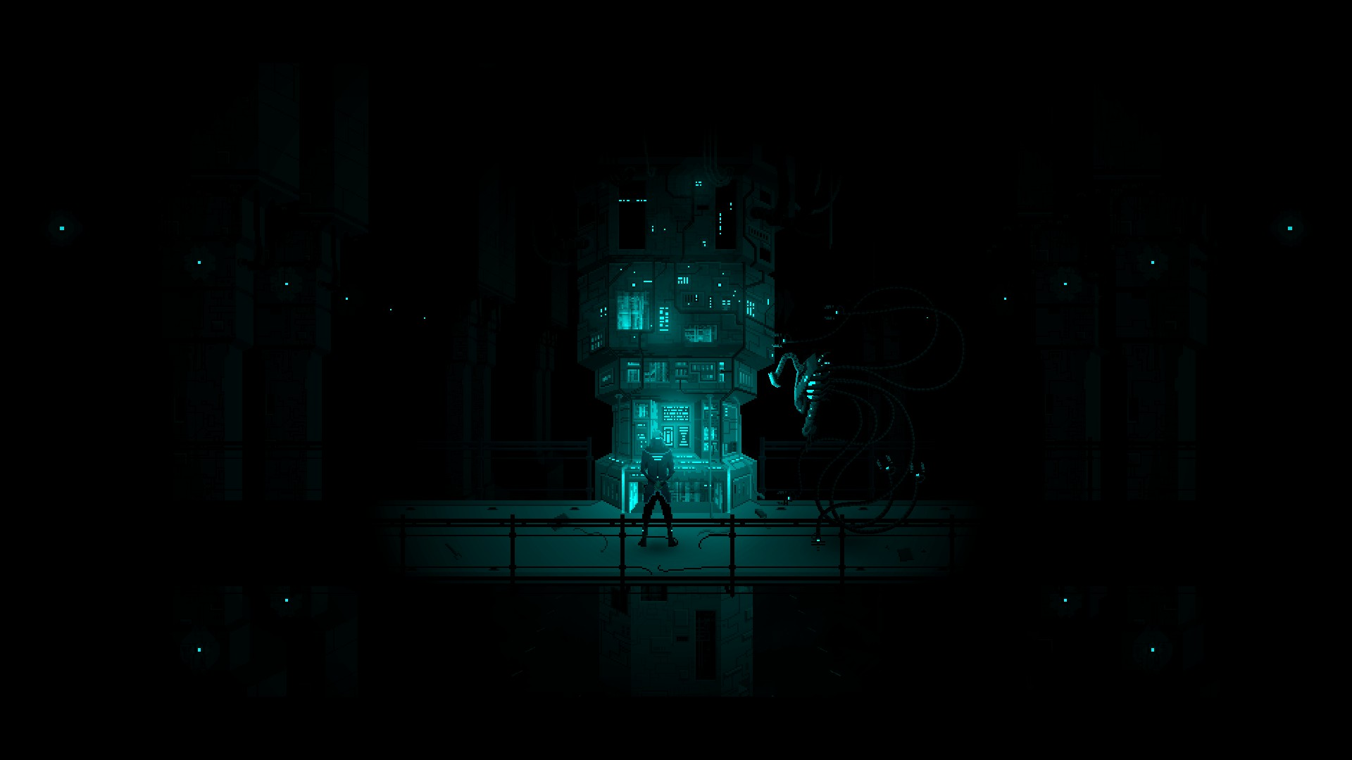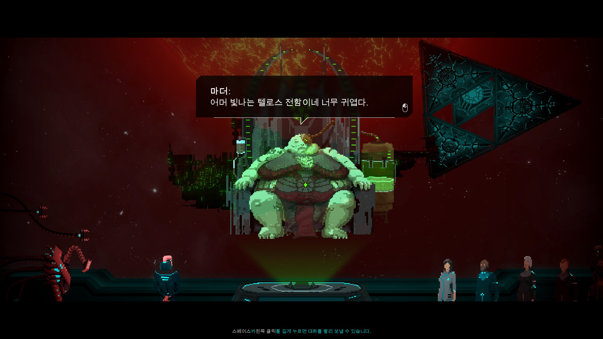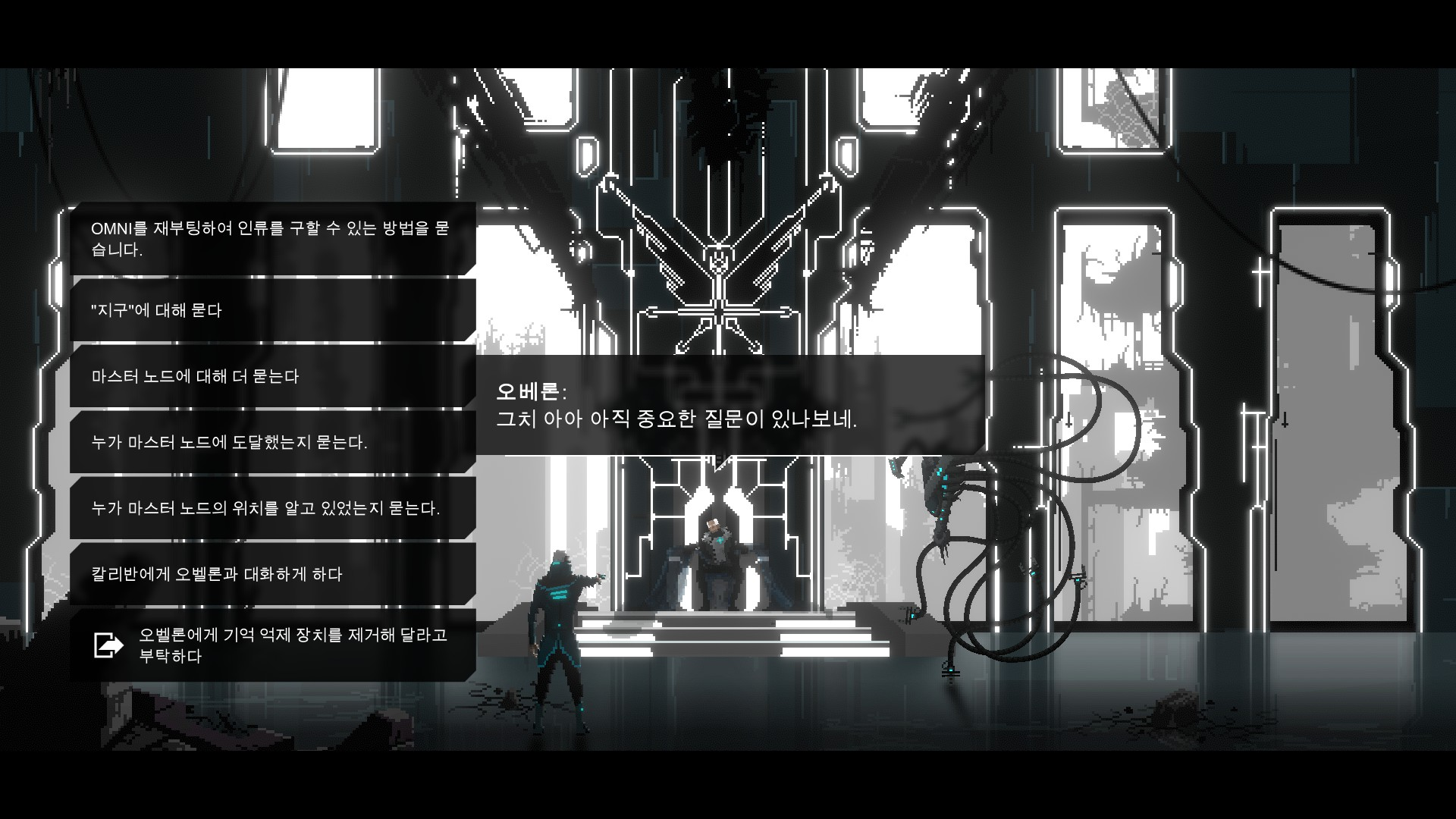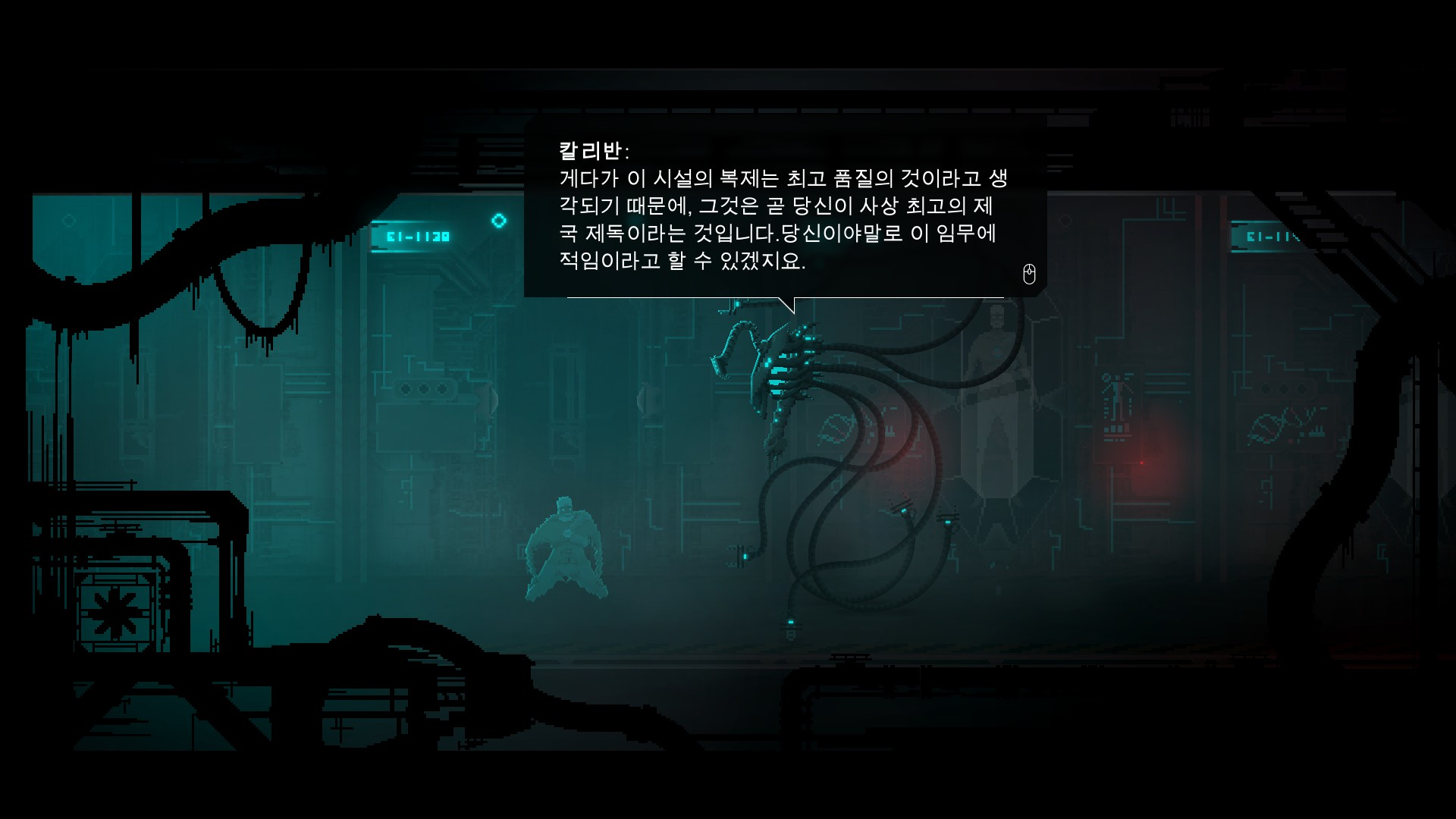 무엇보다 이 게임은 스샷만 보고 오판하기 쉬운 도트 게임인데, 각 장면의 연출이 너무나 좋습니다. 주요 스토리 진행은 당연히 끝내주는 도트 움짤로 만들어 져 있고, 친구 로봇인 칼리반(스샷의 좌측 하단) 촉수 움직임도 참 촉수 닮게 잘 뽑혔습니다.