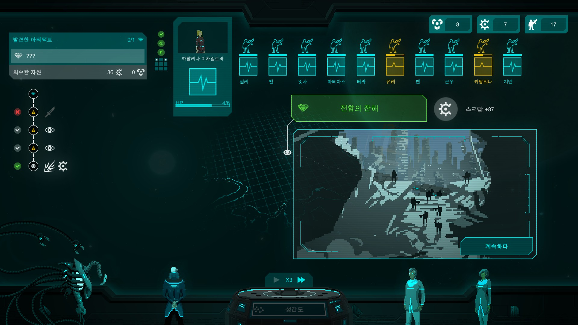 그리고 이건 위 스샷에 나왔던 탐사에서도 매우매우매우 중요하게 작용하는데, 약간은 야구 게임 (숫자 3개 맞추는 게임)과 같은 형태 덕분에, 크루 구성만 잘 해 놓으면, 최소한의 비용으로 최고의 효율을 뽑기도 합니다.