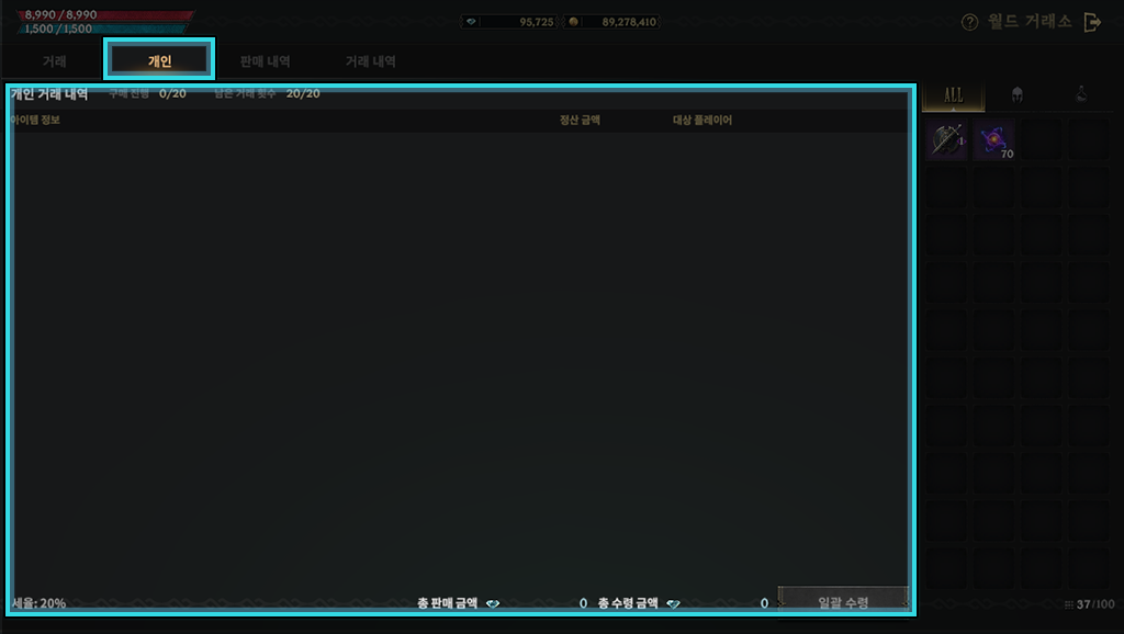 개인 화면에서는 거래할 상대 캐릭터를 직접 만나지 않고 거래소를 통해 개인 거래를 진행할 수 있습니다.
