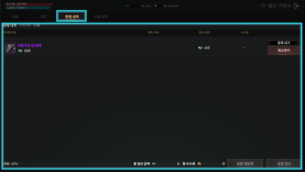 영웅 등급 이상의 아이템만 등록이 가능하며 18%의 세율이 적용됩니다.