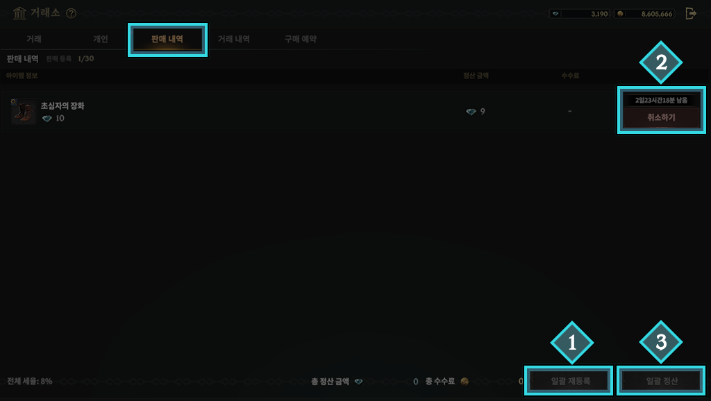 판매 내역에서는 거래가 완료된 아이템에 대해 일괄 정산할 수 있으며,
