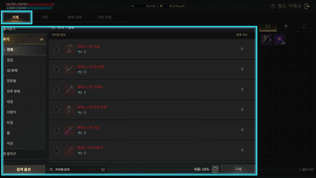 인벤토리 공간이 부족한 경우 구매가 불가하며 본인이 등록한 판매 아이템도 구매할 수 없습니다.