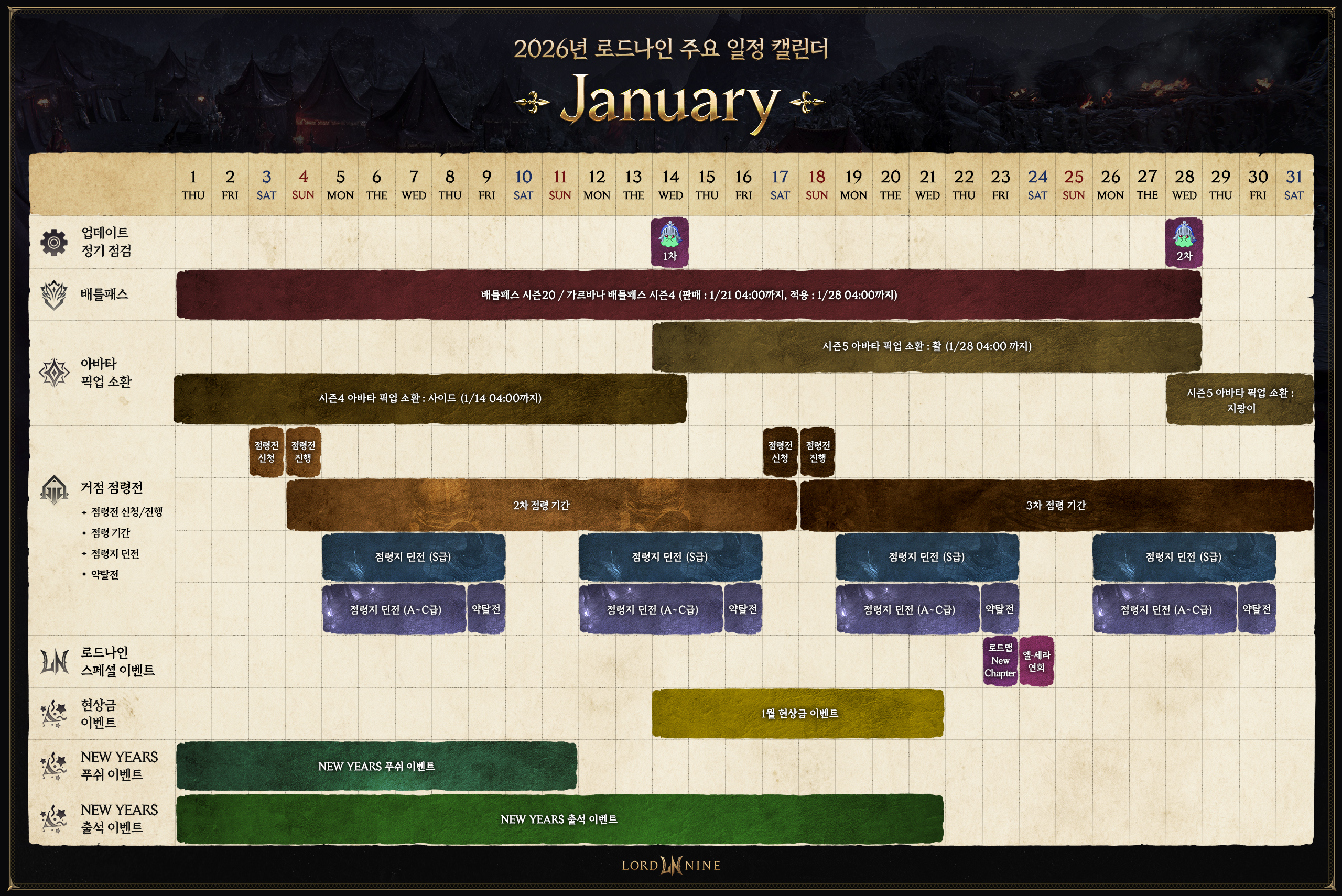 아래 캘린더를 통해 1월에 진행되는 업데이트 점검 및 주요 콘텐츠 등 로드나인 서비스 전반의 일정을 확인해 보시기 바랍니다.