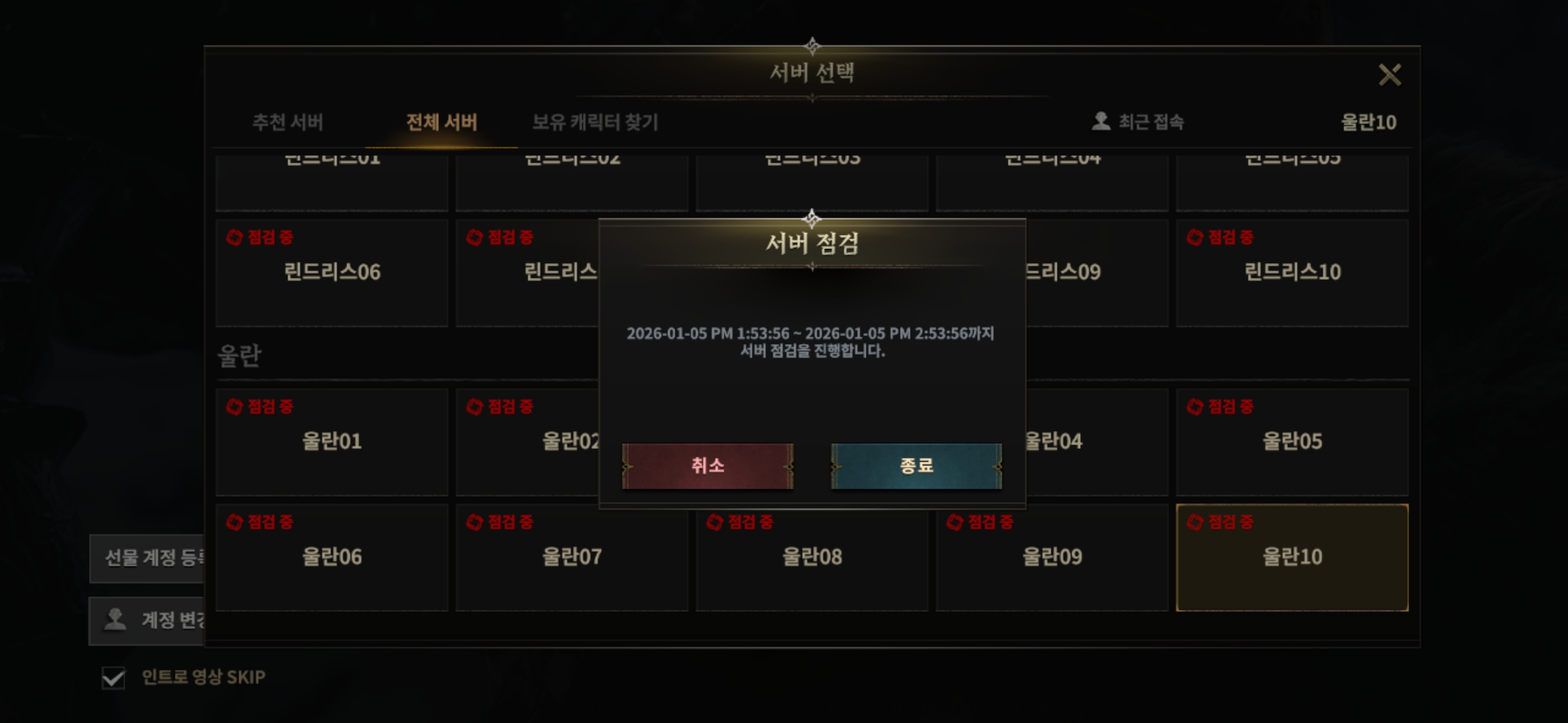 글상세Bug Reports 핸드폰 유저 인데 모든 서버가 점검이네유 [울란]당쇠[S1720961377457911] 05/01/2026 05:09 AM 05/01/2026 02:09 PM (+09:00) view count 28 View MY HOME View Posts View Translated Text Report Share 재접해도 저래유 Reply 0 alarm Notification has been disabled. Newest Newest By registration By recommendation To enter a comment Log In Please Confirm Cancel Confirm