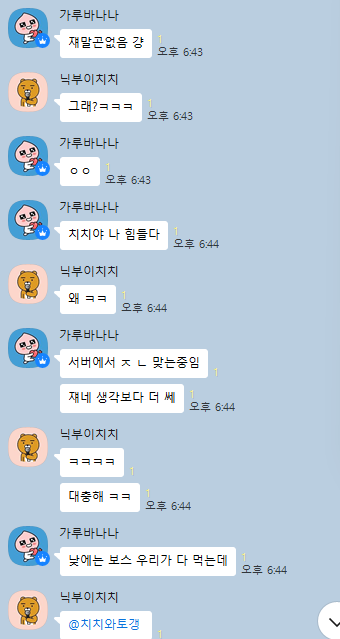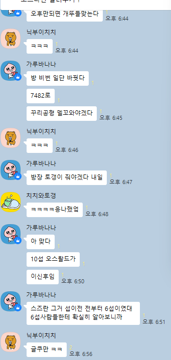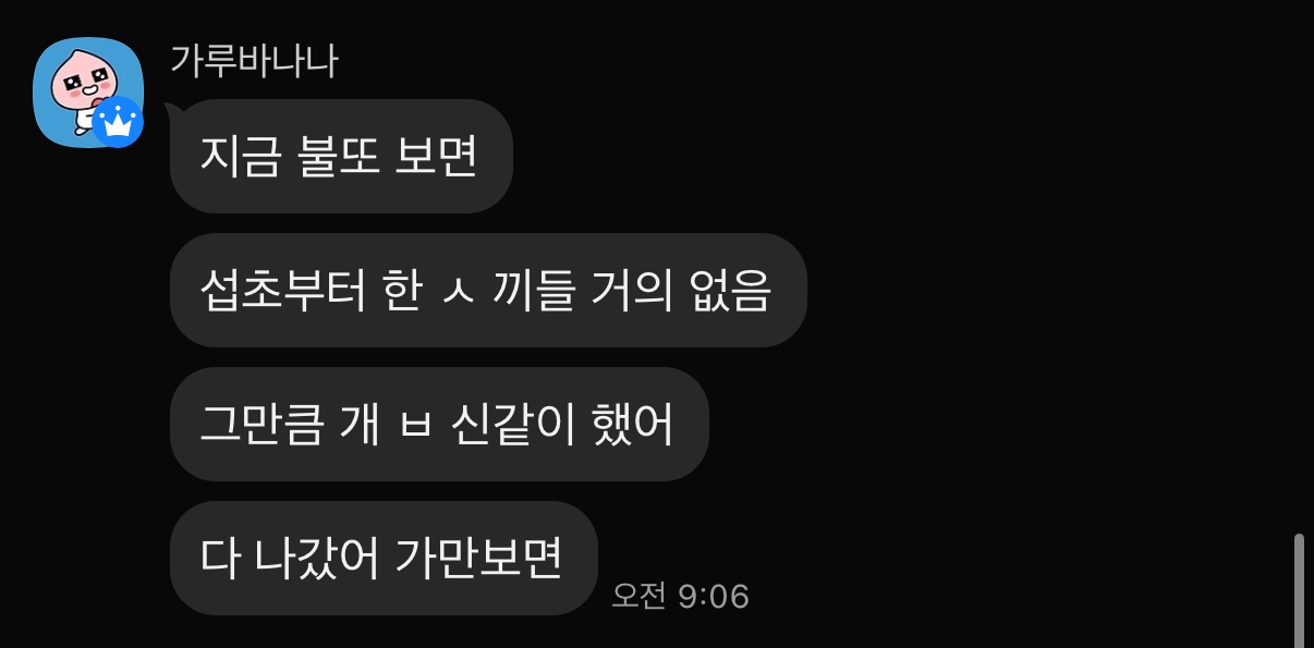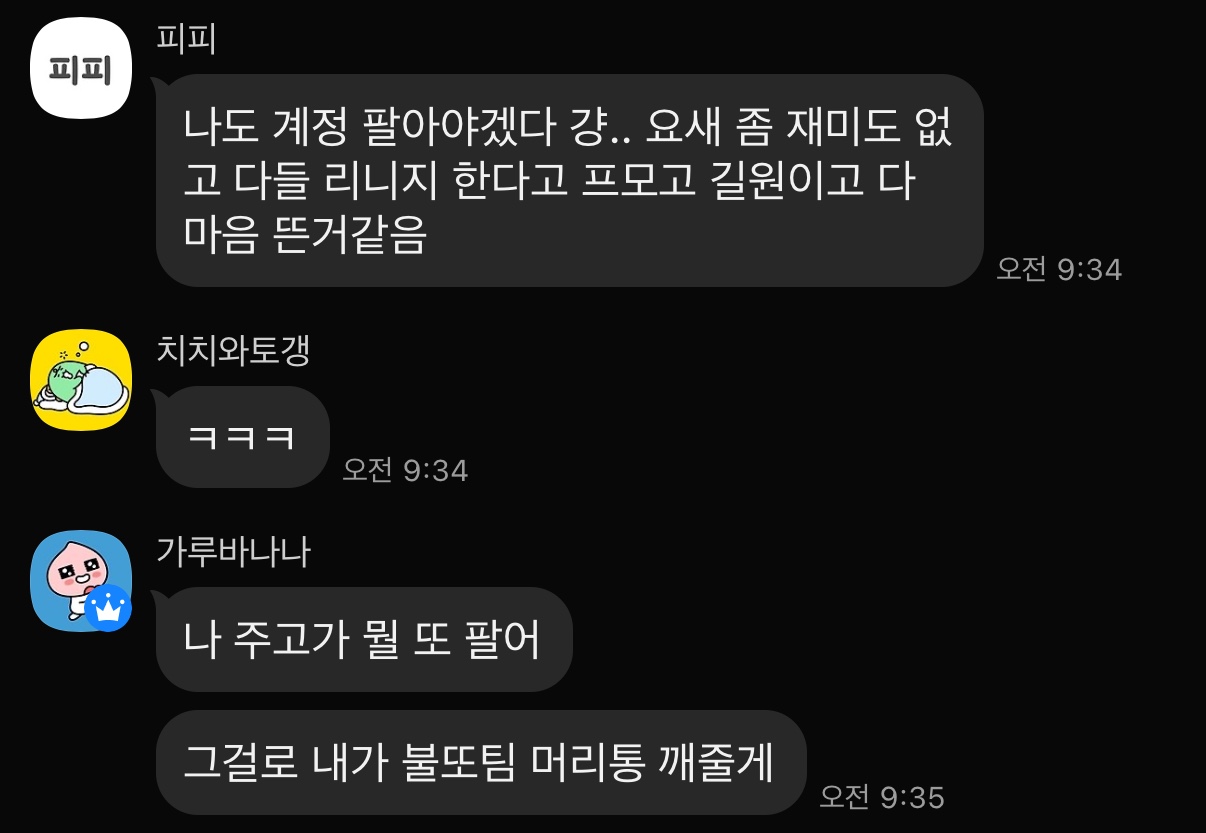 아무나 추측? ㄴㄴ 구매한 캐릭 들키자마자 단톡방 터트리고 쥐구멍에 숨어있음