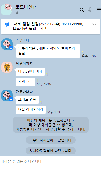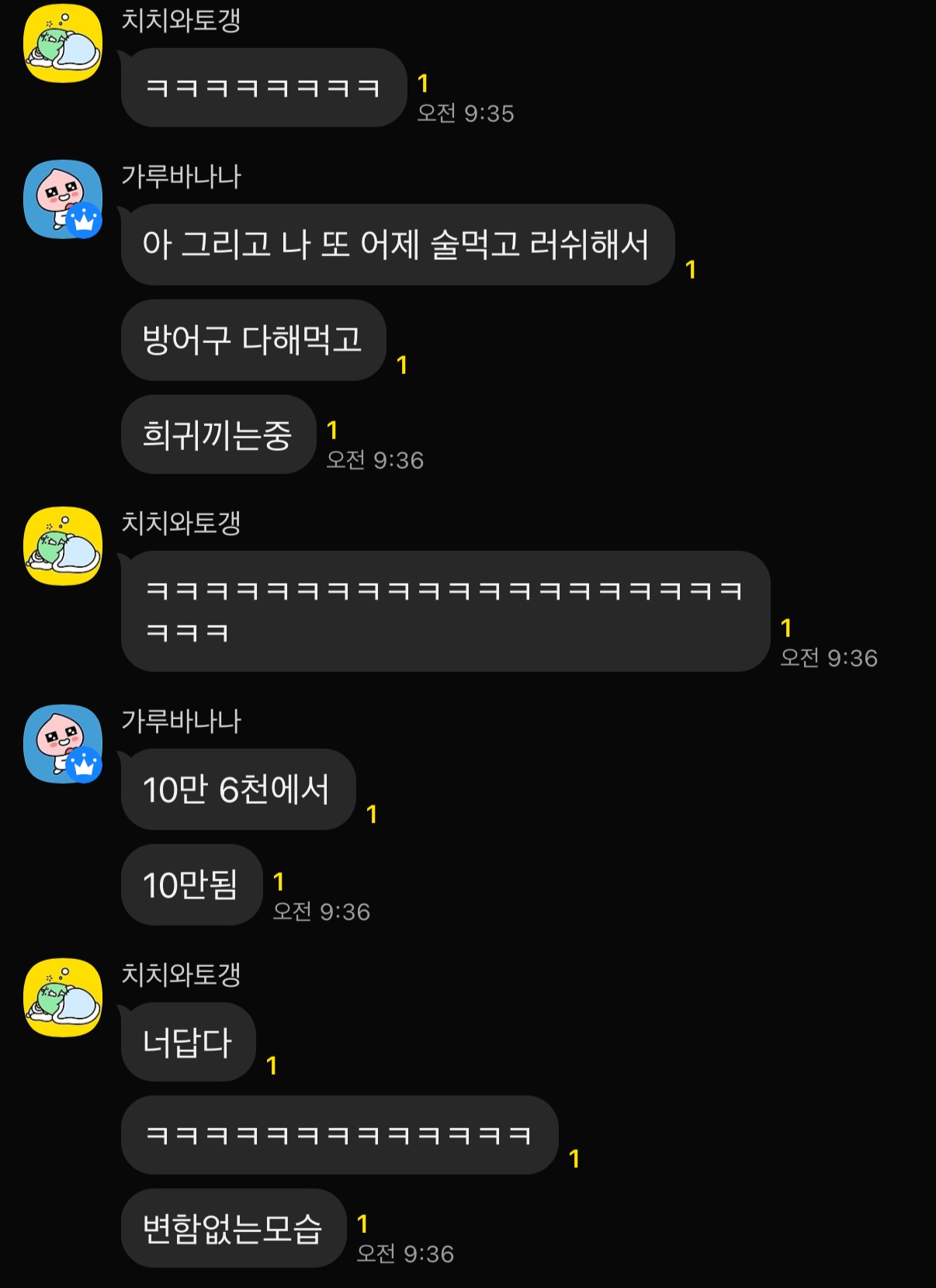 어제 새벽 아이에르 캐릭터 술먹고 어지럽다며 외창 및 카톡에 얘기함 술먹고 러쉬해서 -6천 투력