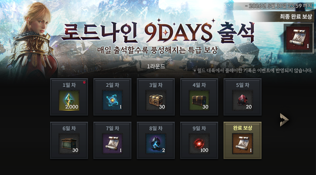 매일 게임에 접속하고 총 6라운드로 진행되는 출석 이벤트를 완료하세요.