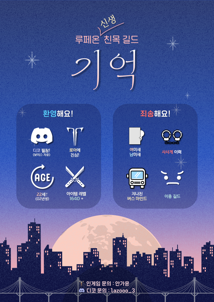 [루페온] 신생,친목길드 ✨️기억✨️에서 신규 길드원을 구합니다!