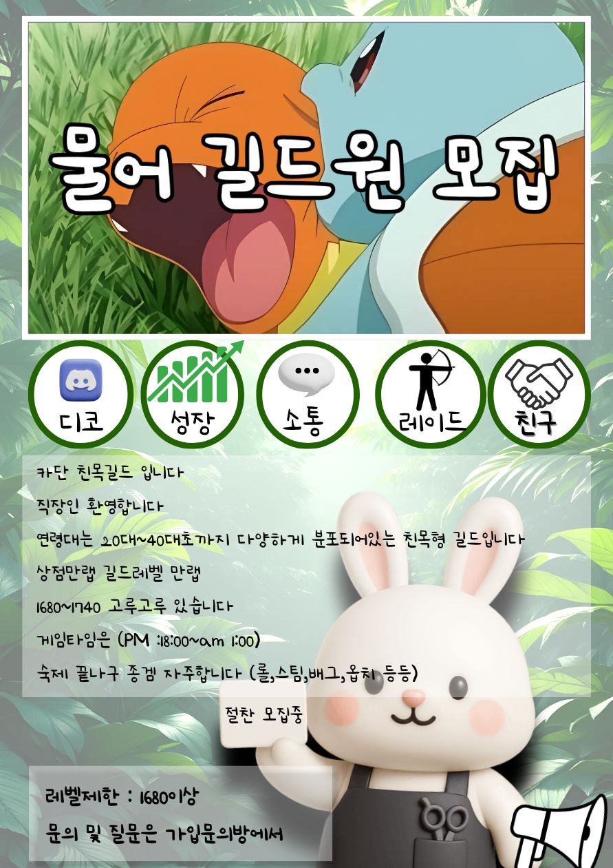 글상세길드 [카단] ☁물어☁길드에서 길드원 모집합니다 / 친목 , 소통 , 직장인 그레이베어TV 2025-11-12 09:15 2025-11-12 18:15 (+09:00) view count 46 MY홈 보기 작성글 보기 신고하기 공유하기 🔹친목길드입니다🔹상점만랩/ 길드만랩🔹연령층 20- 40 이에요🔹 25년 9월에 생성된 신규친목길드에요!🔹 시간대는 18:00 ~ 1:00 입니다🔹 길드원:22명🔹 1680이상🔹 복귀및 뉴비 환영합니다🔹 혼자 게임하기 적적하신분 🔹 친구/깐부 같이 가입 환영합니다🔹종겜두자주해요! 🔸직장인환영 https://open.kakao.com/o/gNAiwrrh 가입문의링크 댓글 0 alarm 알림이 해제되었습니다. 최신순 최신순 등록순 추천순 댓글을 입력하려면 로그인 해주세요. 확인 취소 확인