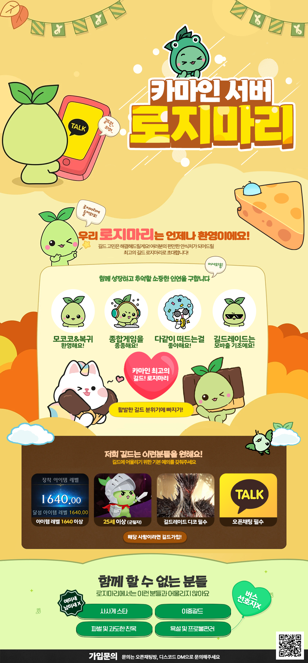 ㆍ참여조건 : 오픈채팅 필수 (공지, 친목), 길드레이드 참여 시 디코 필참 (듣코 가능)