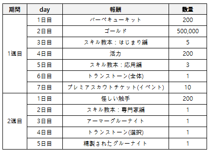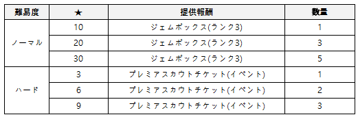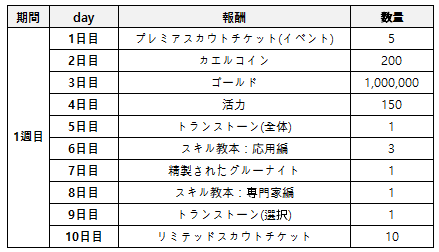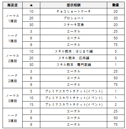 - ダンジョンクリア、イベントミッション達成でプレミアスカウトチケット(イベント)及びエーテルを含め、