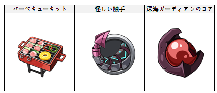 【バーベキューキット、怪しい触手、深海ガーディアンのコア】を使用して様々なアイテムを獲得できます。