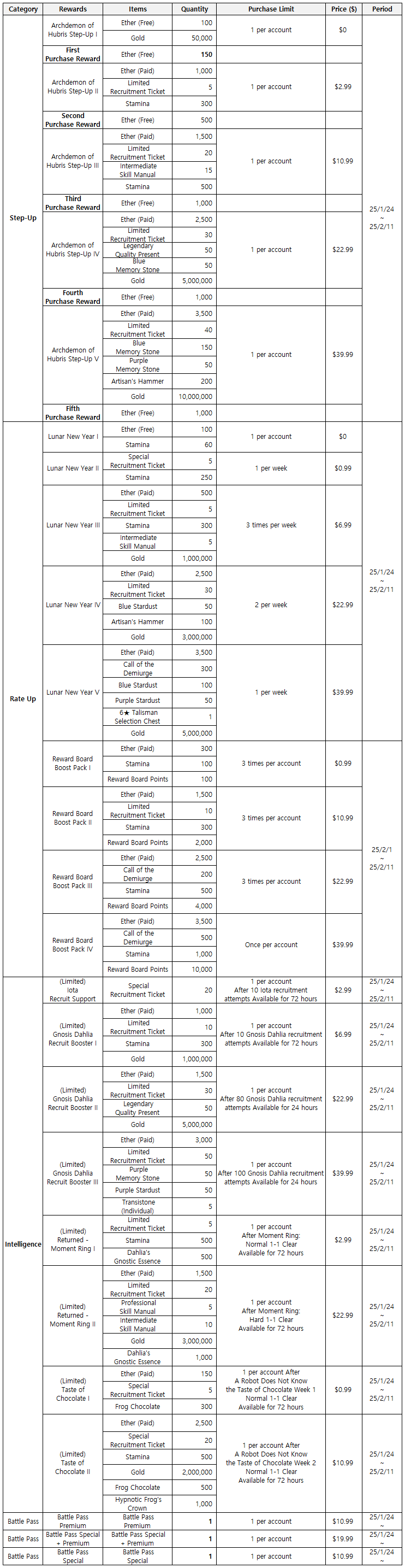 - Event Shop Availability: 01/31/25 (Fri) 00:00 UTC – 02/11/25 (Tue) before the maintenance