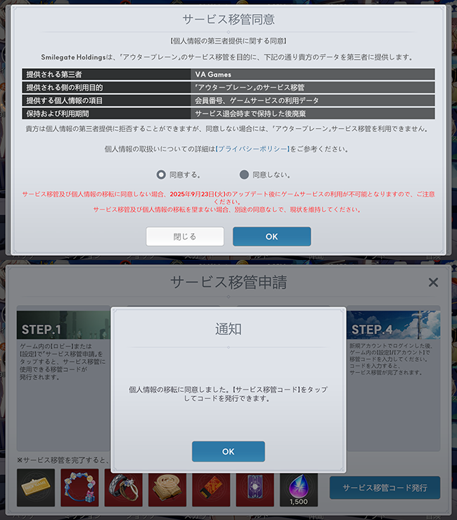 - アウタープレーンサービス移管日程:2025年9月23日(火) メンテナンス終了後~2025年9月26日(金) メンテナンス終了後