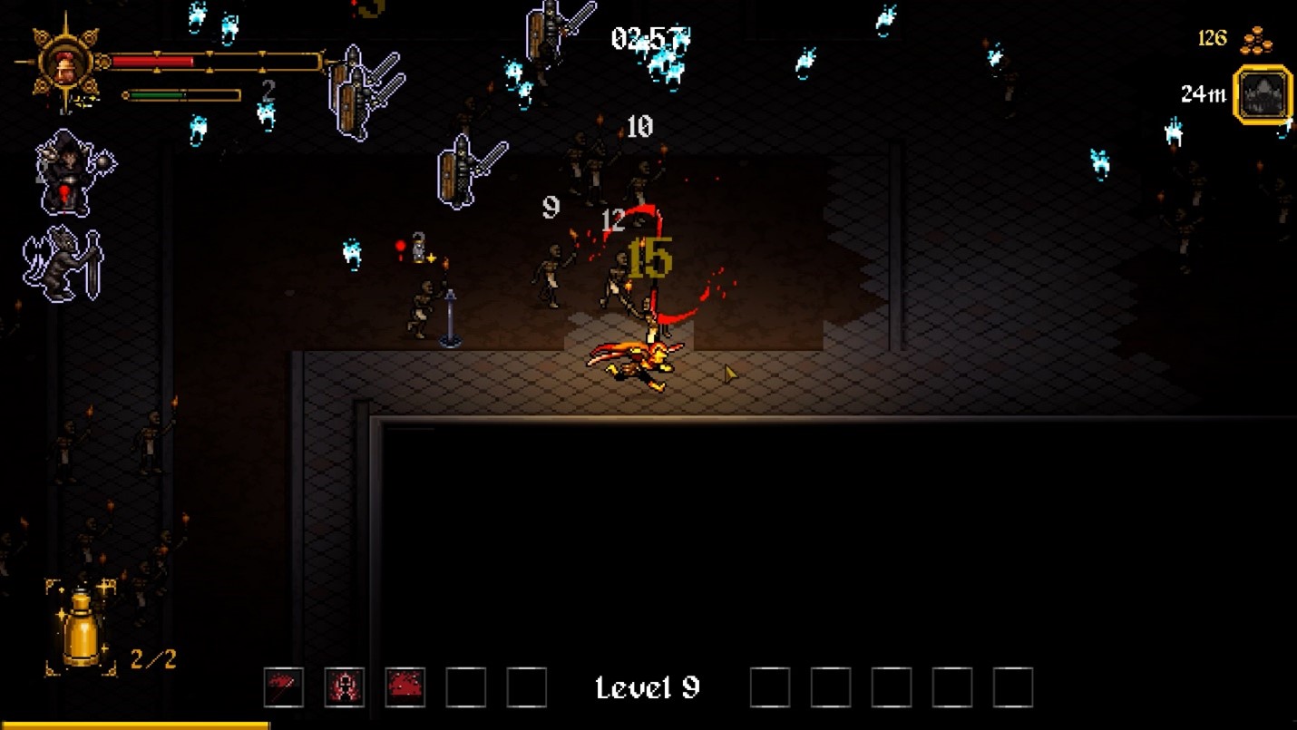 The game uses a retro pixel art style but creates a beautiful dark-fantasy world with smart use of light and effects. Every area - from foggy forests to castle corridors lit by flickering torches - has a dark, gothic, and attractive feel. Small details like light shining on the ground make the world feel alive.