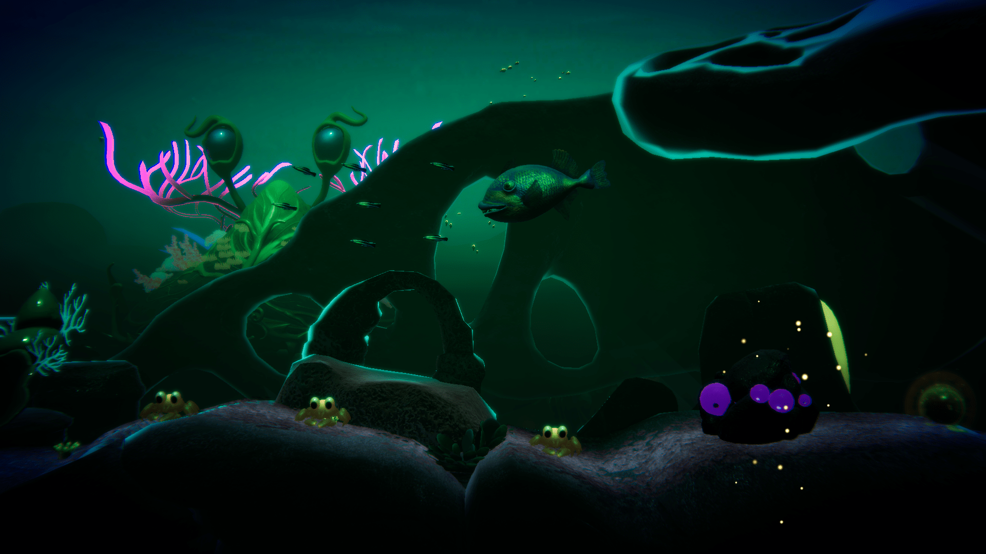 Visually, Crab God is cohesive and charming. The art style leans toward soft colors and gentle animations. Coral reefs, sea creatures, and Crablings all feel like they belong in the same world. Effects are subtle but effective, especially lighting as you descend into deeper waters.