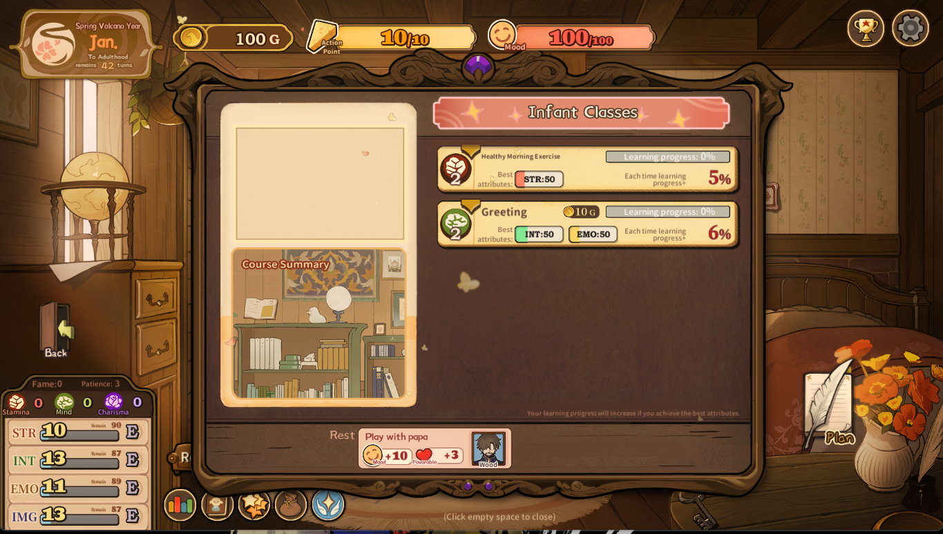 Also similar to Princess Maker, you get to raise her stats by scheduling and being nice to her. There are lessons she can take and activities she can learn to improve herself. I do not want to be a bad father though, and I am being extremely nice to her hoping that she will not get stressed. Please. She is said to be doing well at lessons, though. When the daughter grows up, there are a wide variety of part time jobs to earn stats and money.