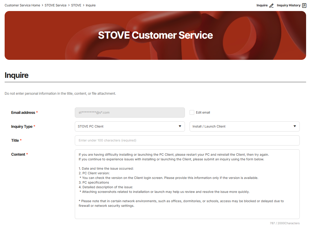 Hello guys, please send ticket to Customer Service with STOVE PC Client - Install/launch Client type.