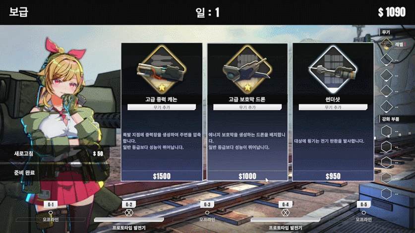 1日を生き延びるとショップで資金を消費できます。毎日基本給の1,000も入ります。ショップでは新武器・強化、強化パーツ(パッシブ)、さらには追加の発電機も販売。資金が乏しいなら買い物は見送り推奨——更新コストが上がる一方で価格はあまり変わらないため、貯金が賢いです。
