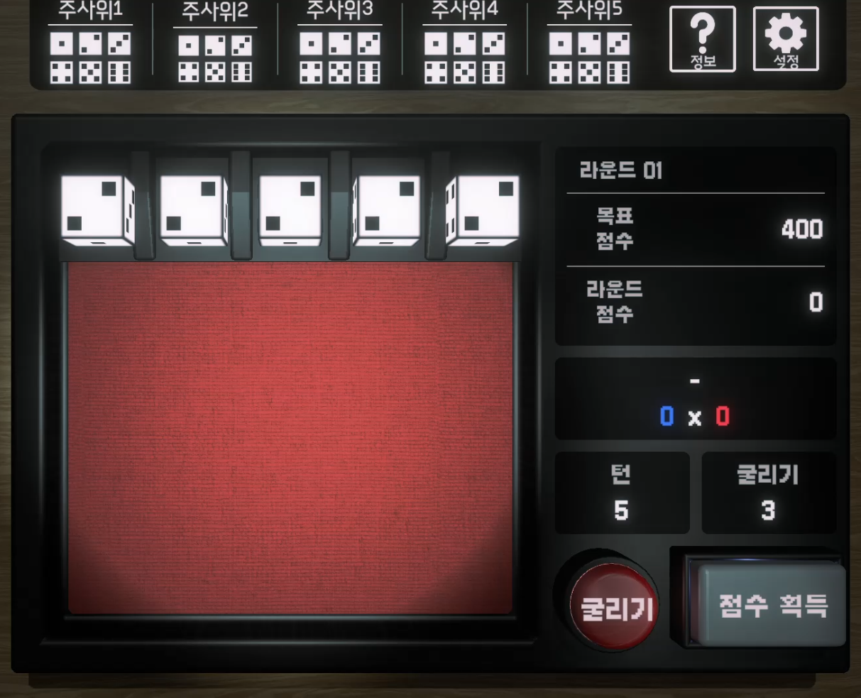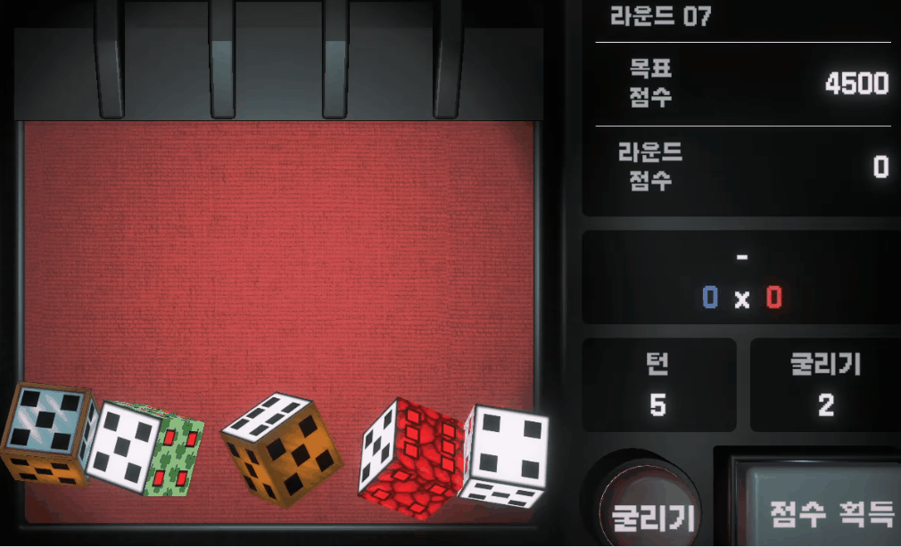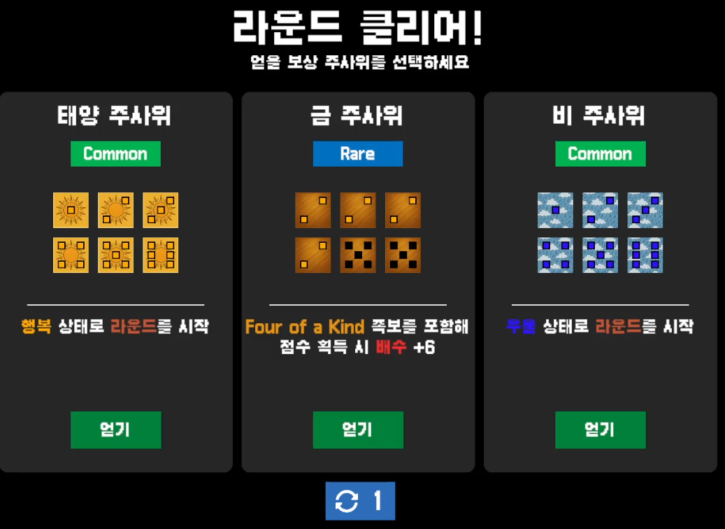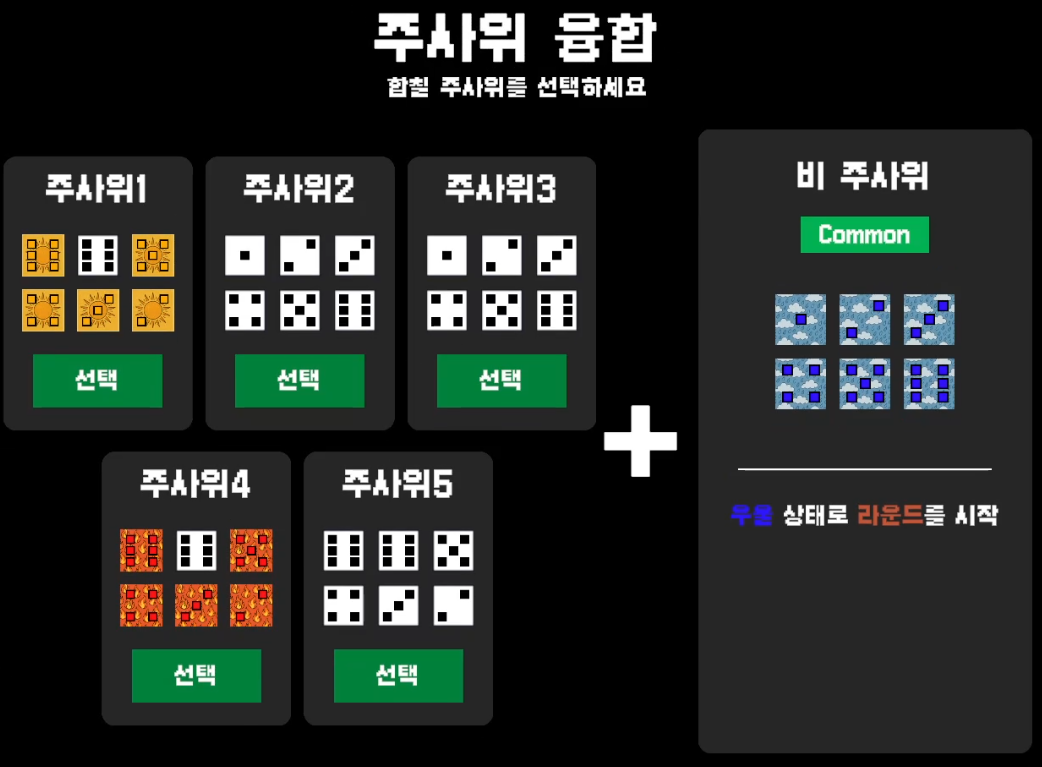 덱빌딩 로그라이크입니다. 이 게임은 총 주사위 5개를 내가 원하는 덱으로 만들어 낼 수 있습니다.