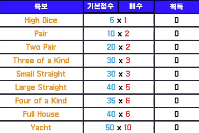 게임의 룰은 모두 "Yacht(요트, 야추)"를 따라갑니다.