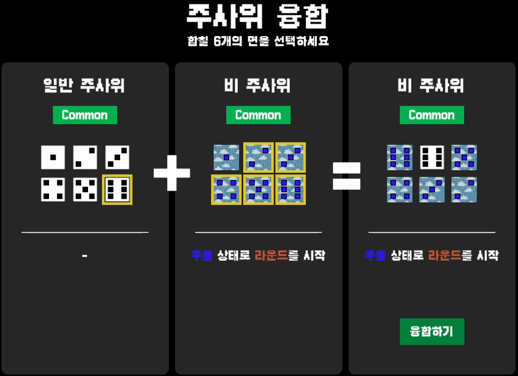 한 주사위당 총 6개의 효과를 넣을 수 있으며, 이때 면의 눈 수는 임의대로 변경할 수 있습니다.