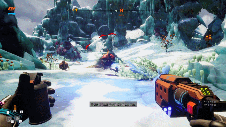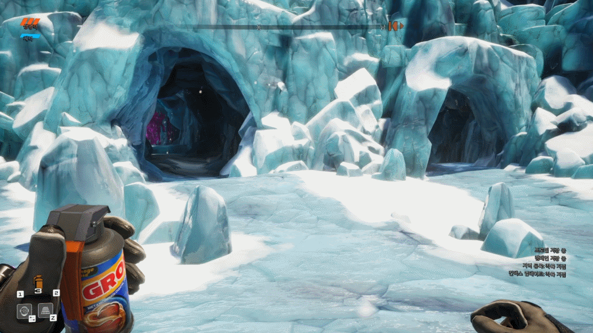 총으로 수정 산호들을 파괴하며 나오니 더 넓은 설원과 함께 저 멀리에 아름다운 자연이 또 보이네요.