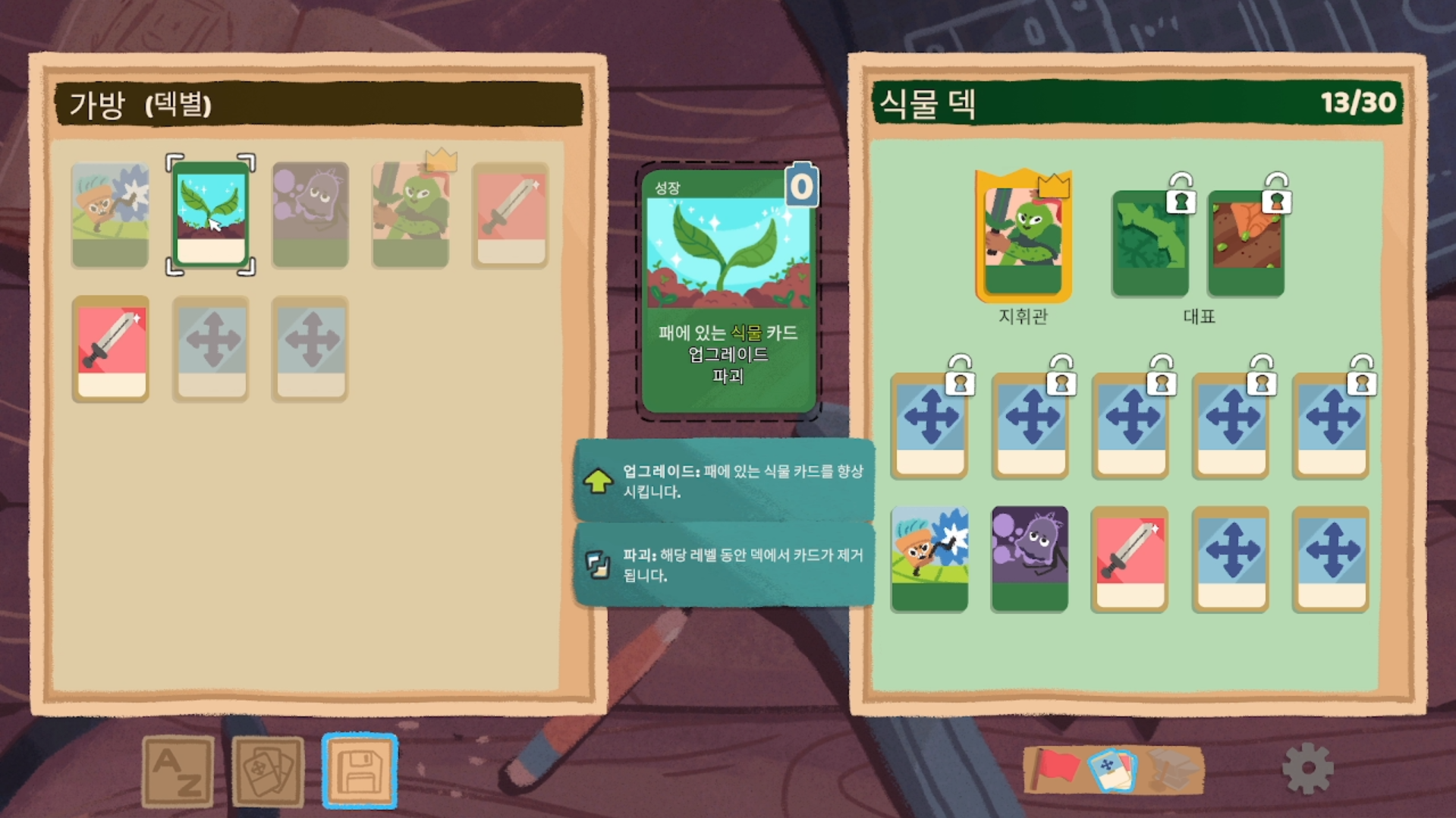 덱에는 5장의 이동 카드와 대장 카드의 기본 카드 두 장은 고정인 채로 최소 12장, 최대 30장의 카드를 덱에 넣을 수 있습니다.
